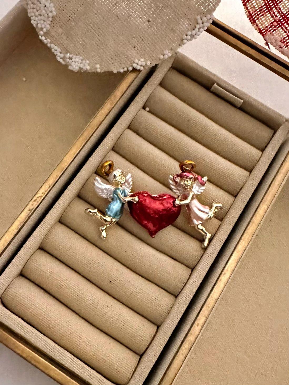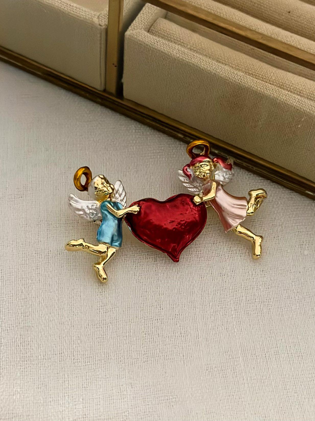 Kırmızı Kalp Tutan İki Melek Figürlü Broş