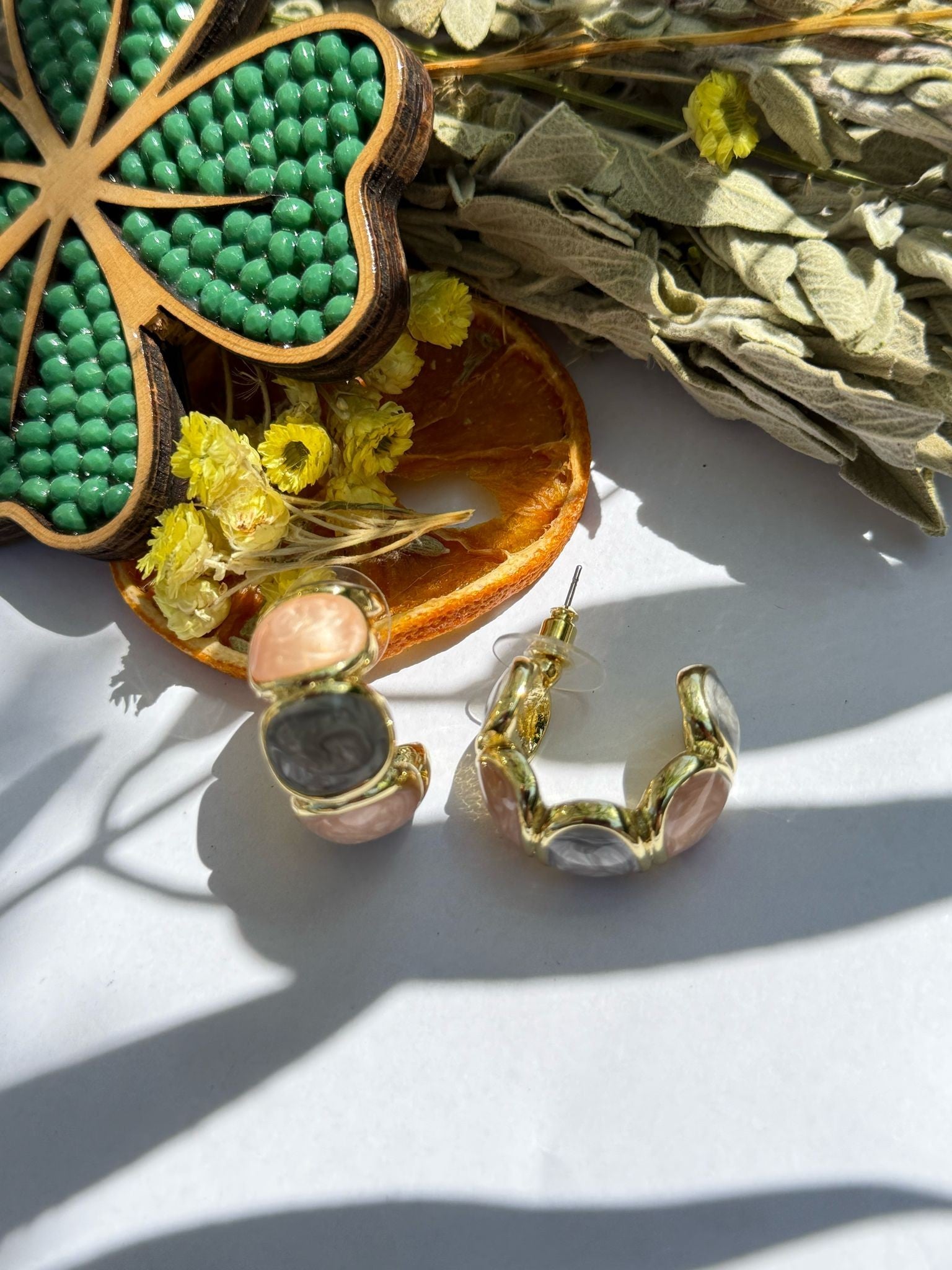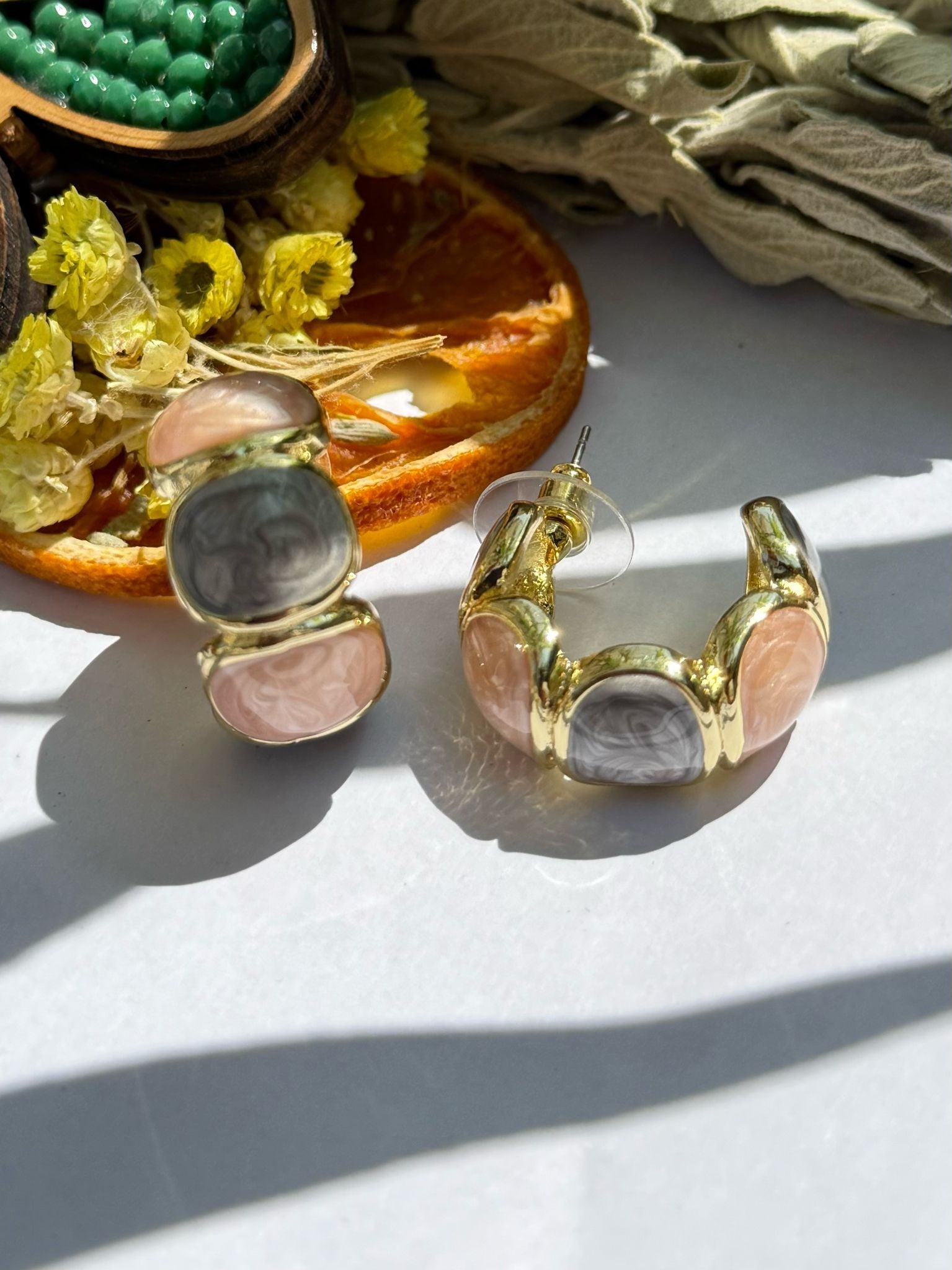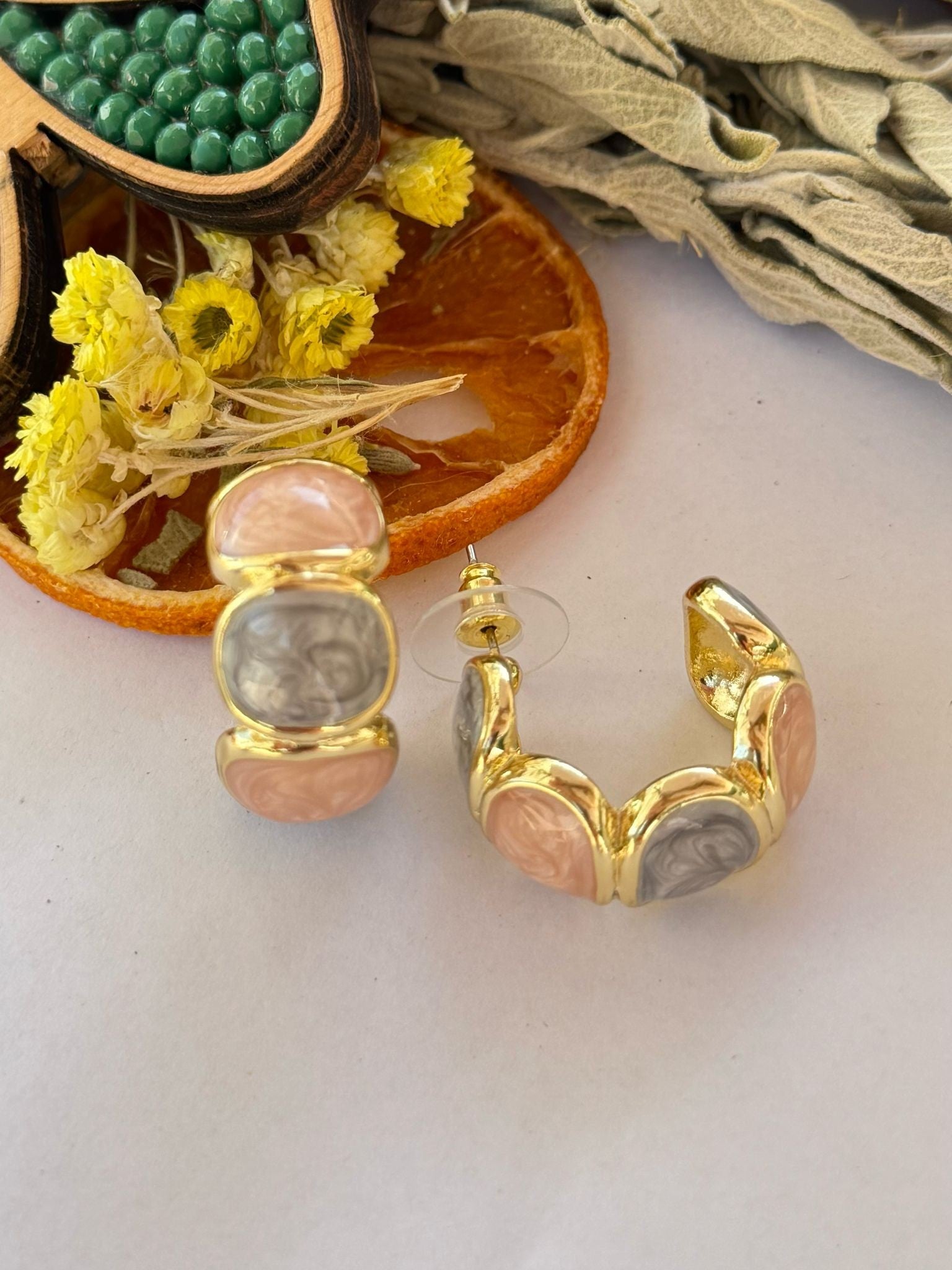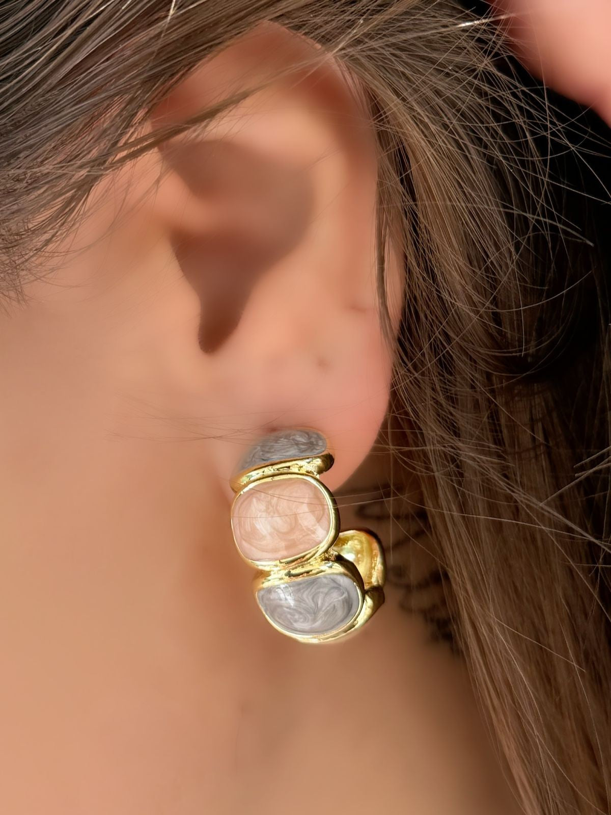 Premium Serisi İki Renk Porselen Detaylı Gold Halka Küpe