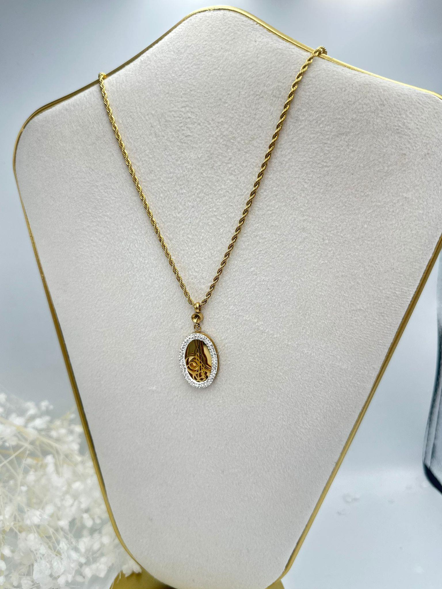 Burgu Zincir ve Zirkon Taş Detaylı 18K Altın Kaplama Tuğra Kolye