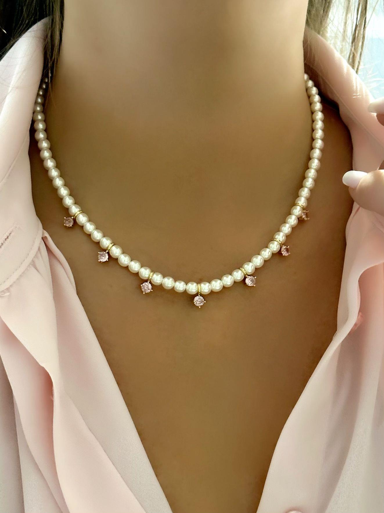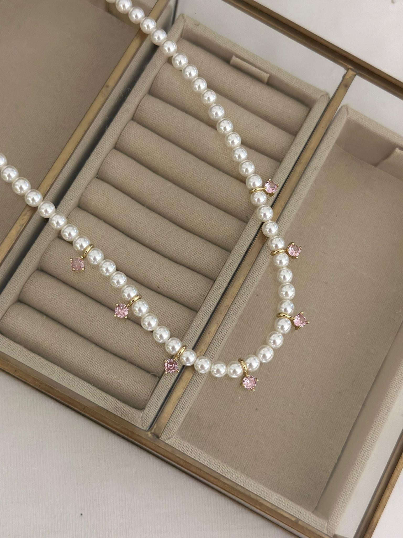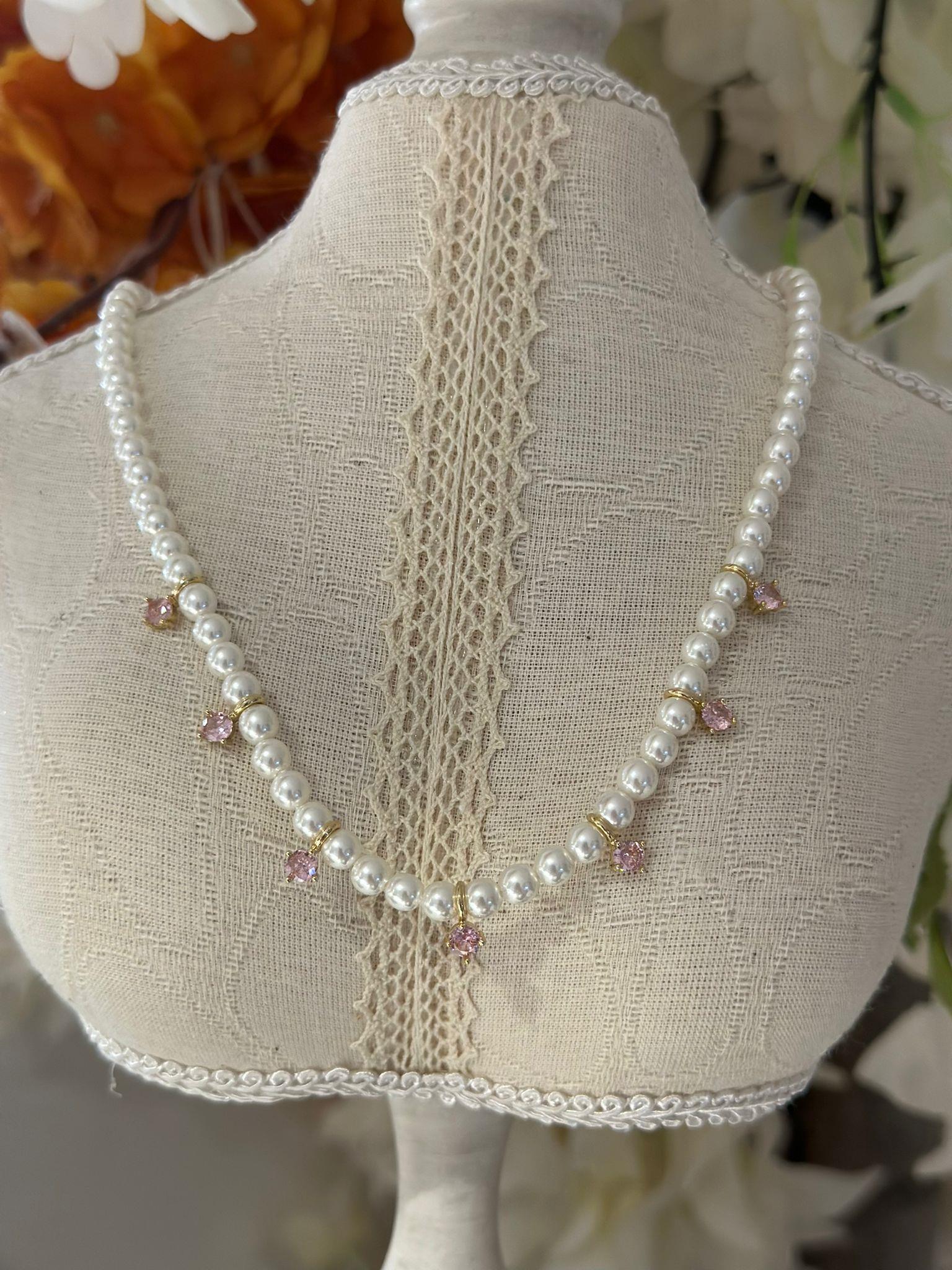 Özel Seri Pembe Taş Detaylı İnci Kolye (40 cm)