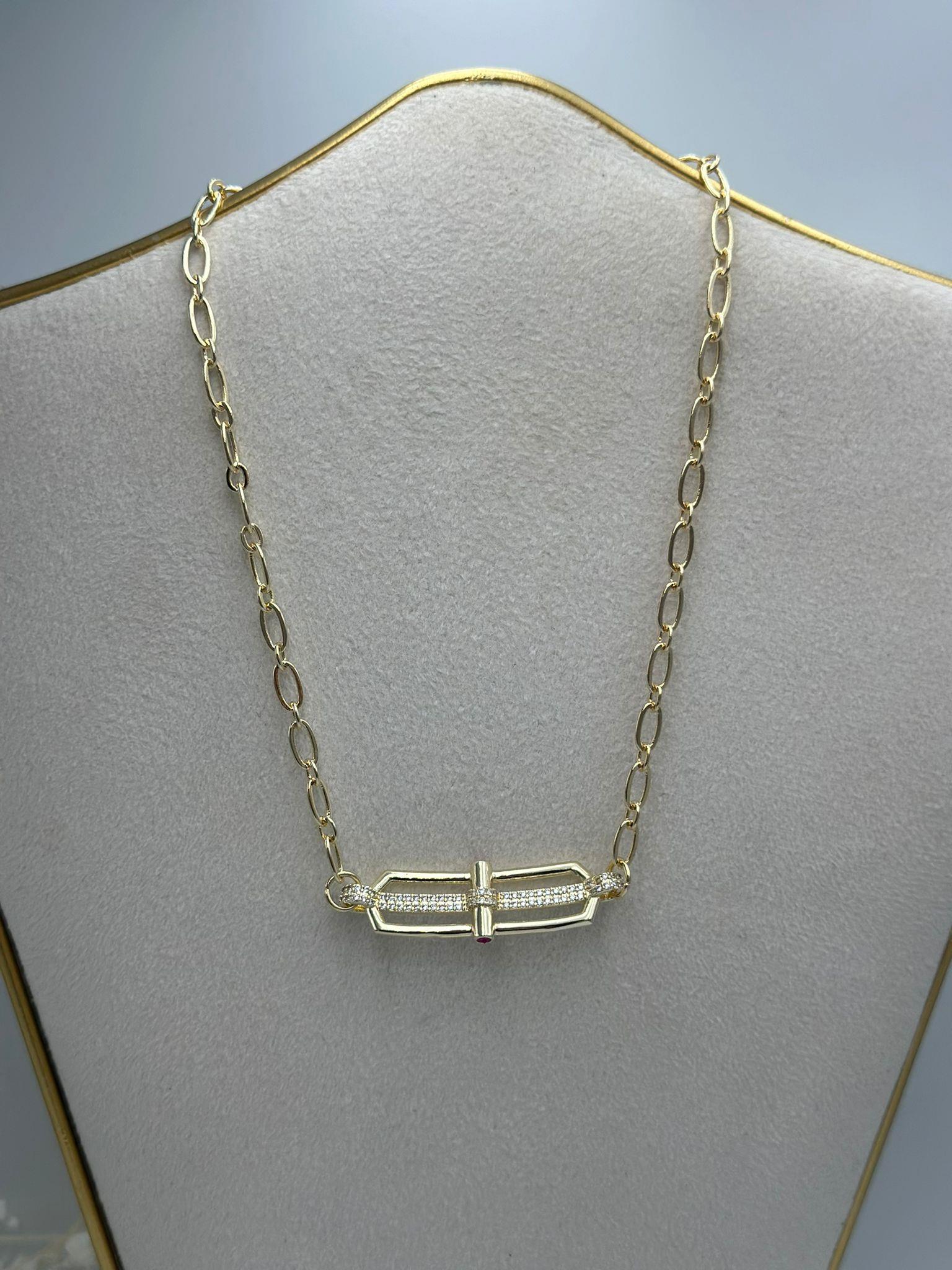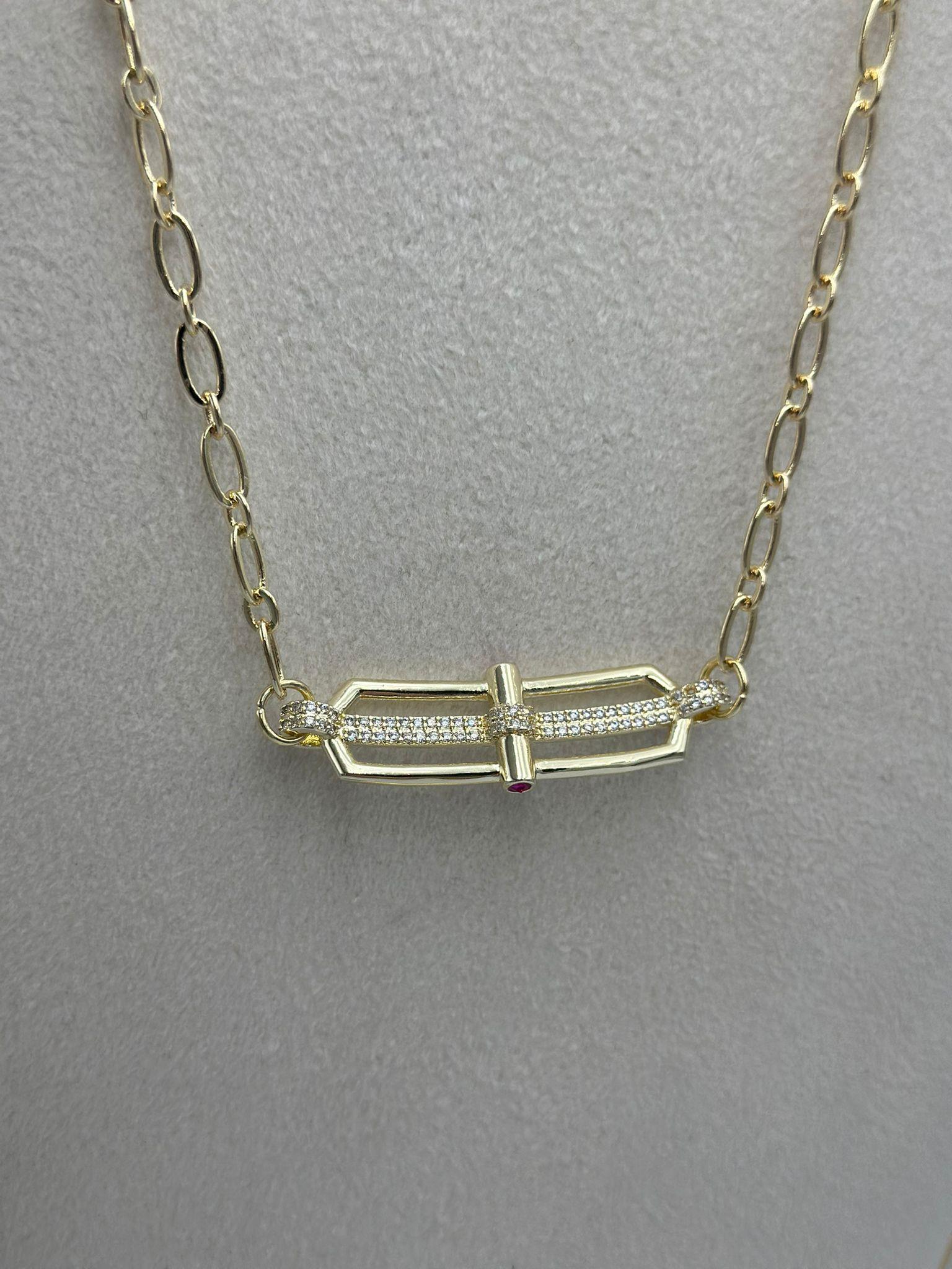 Zirkon Taş Ve Fuşya Taş Detay Kolye (Çelik)