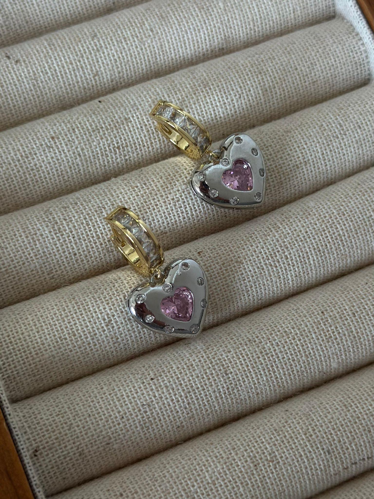 Özel Seri Zirkon Baget Taş Detaylı Minimal Kalp Küpe (Pirinç Kaplama)
