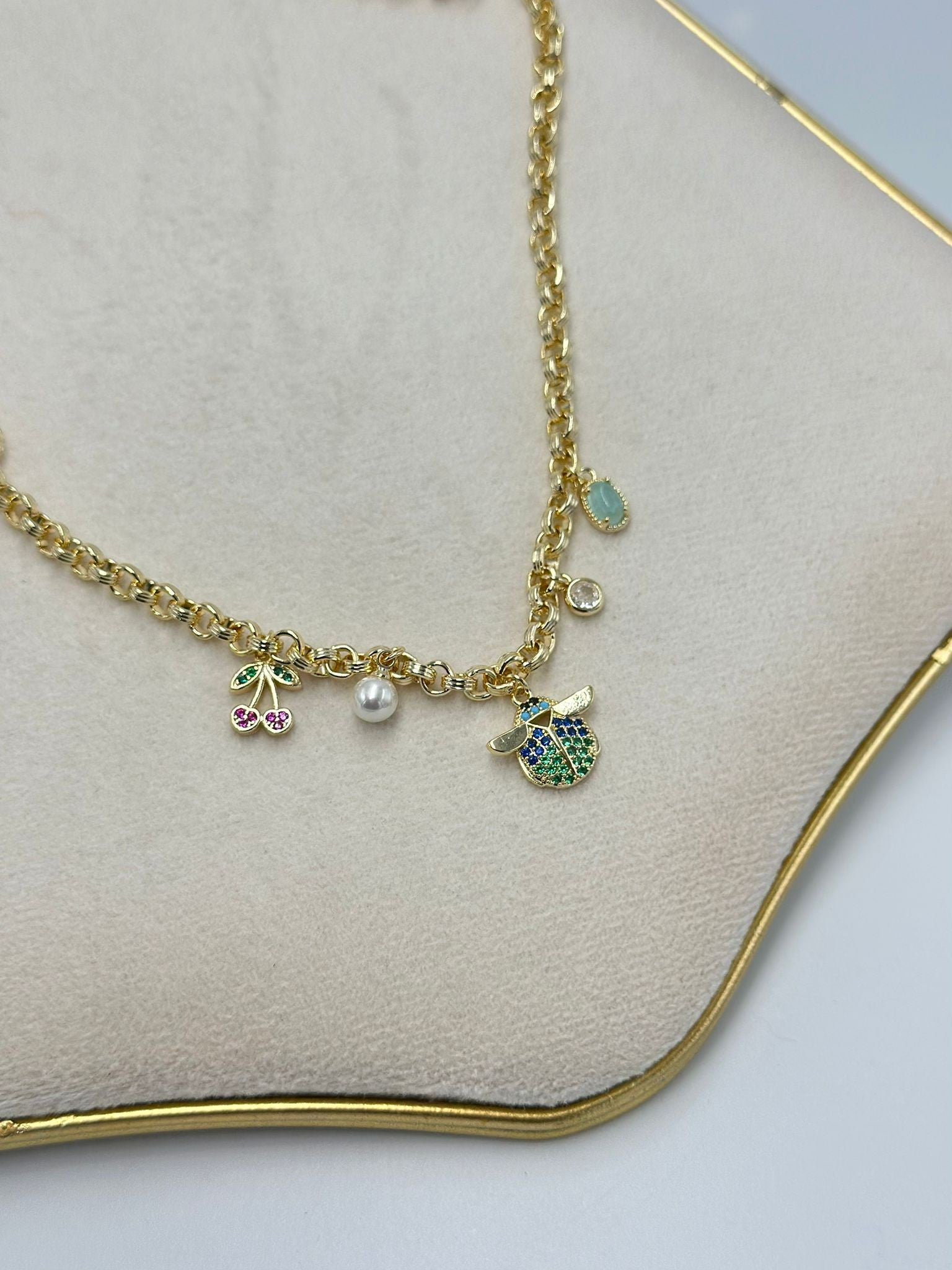 Arı Ve Kiraz Detaylı Charm Çelik Kolye