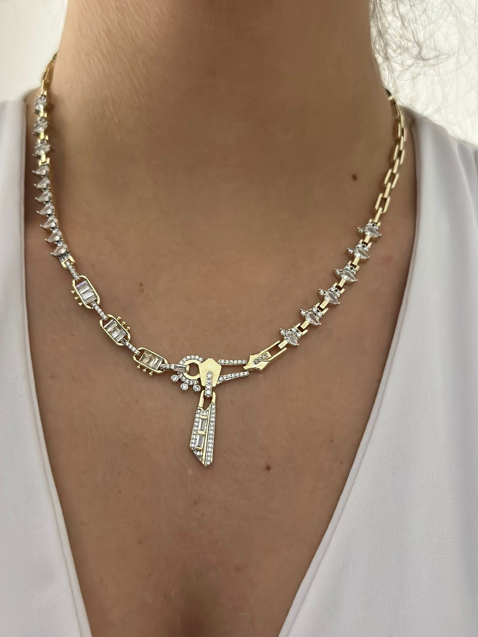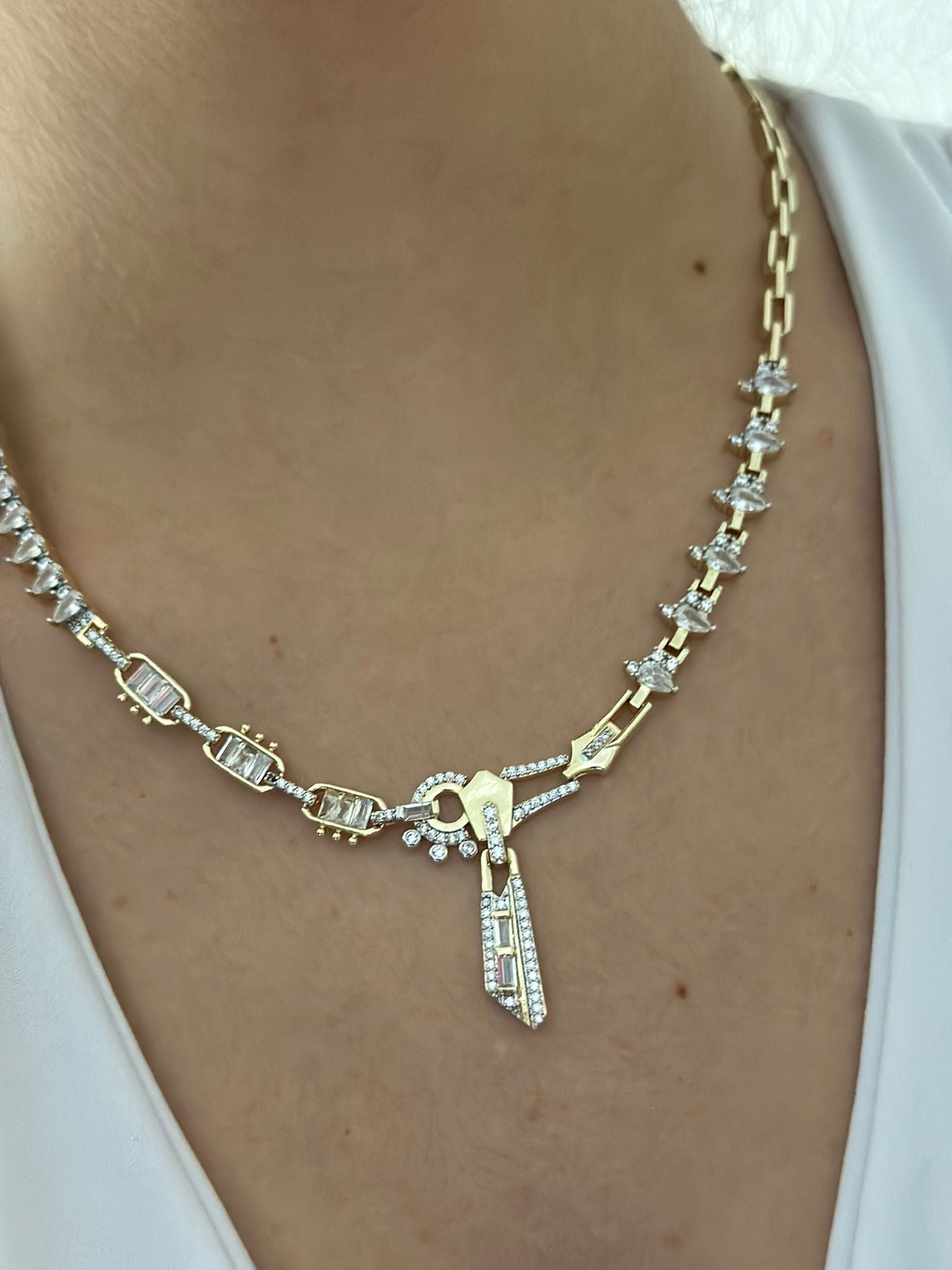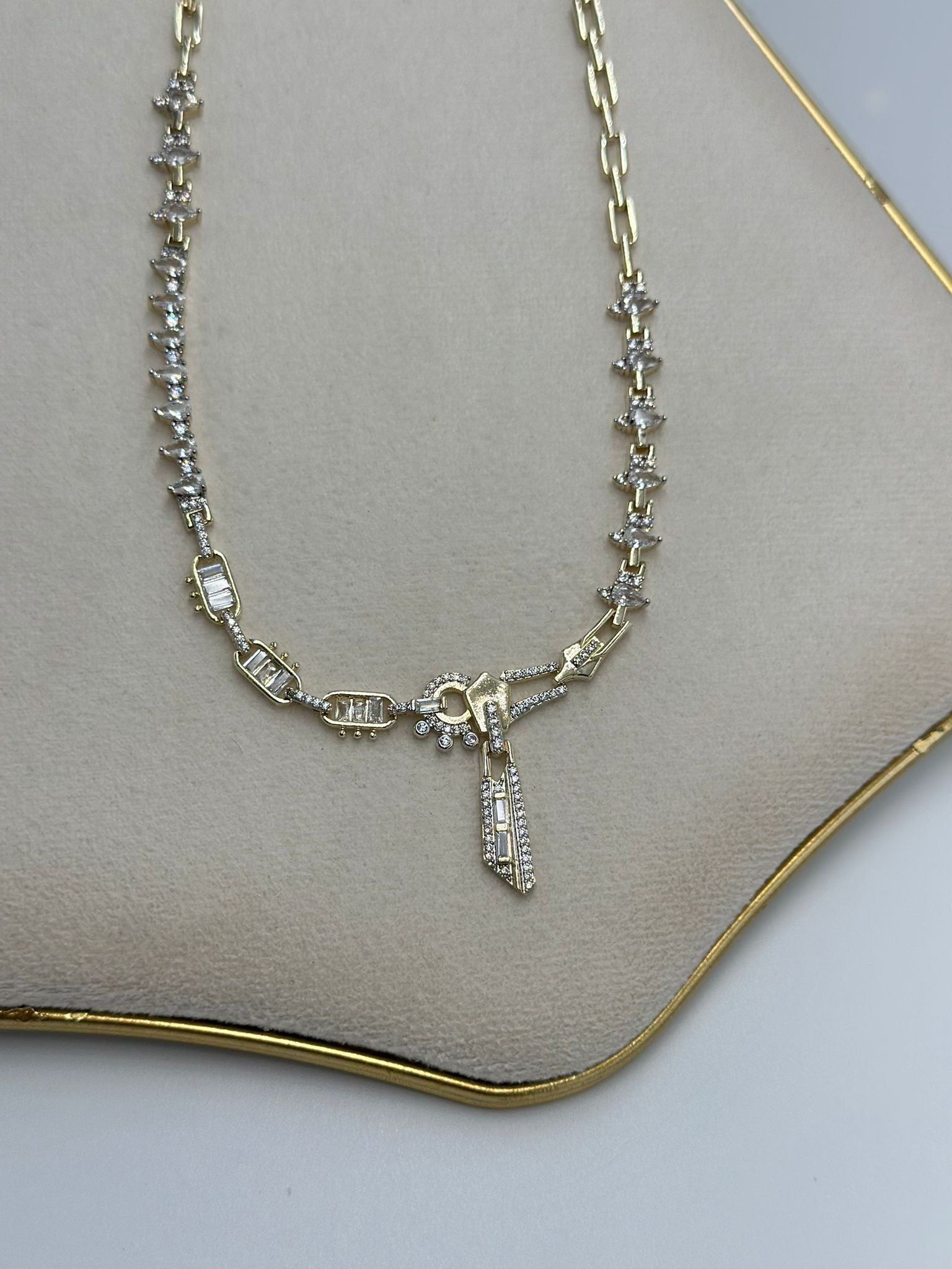 Baget Taş Detaylı Fermuar Çelik Kolye