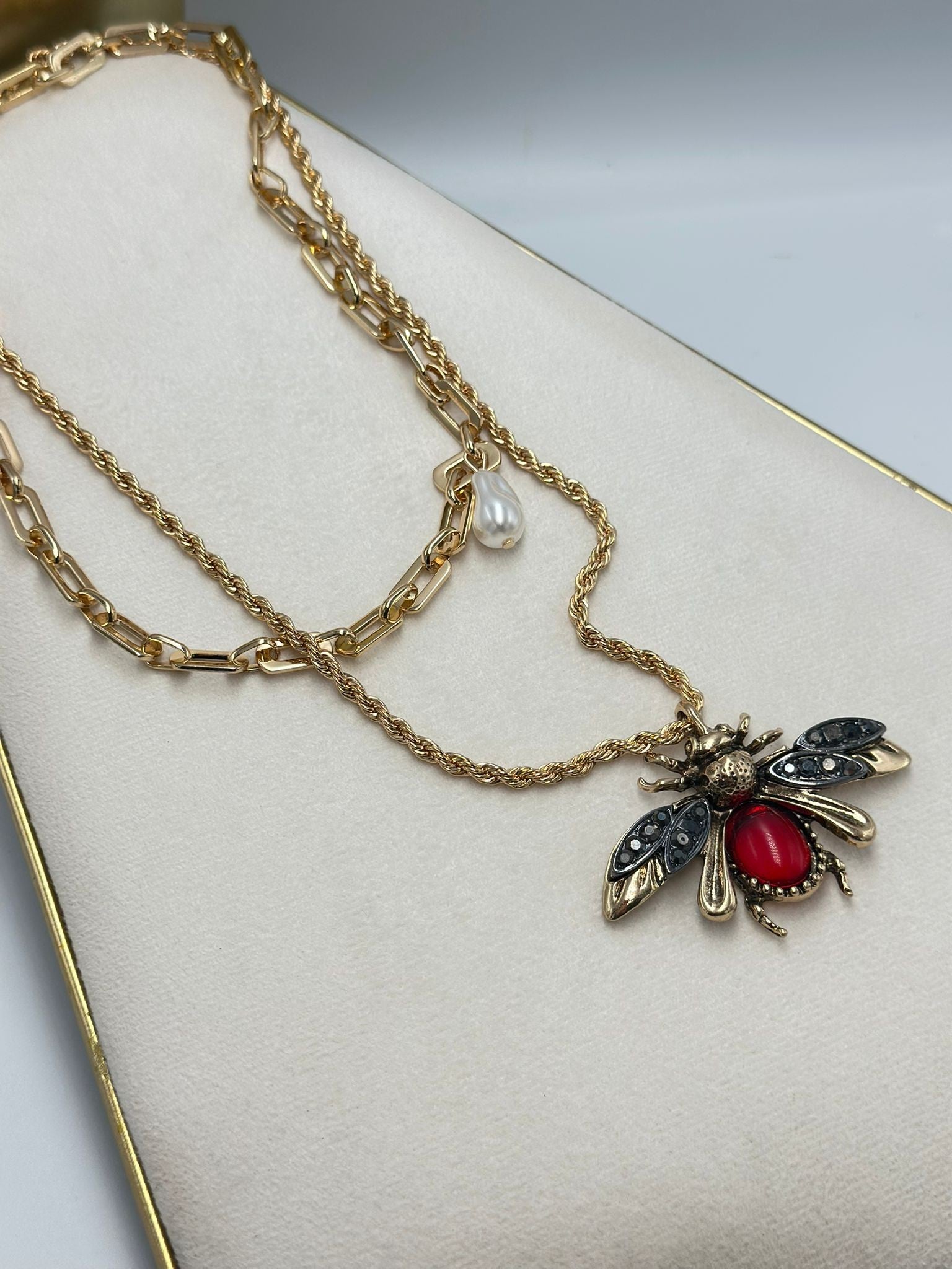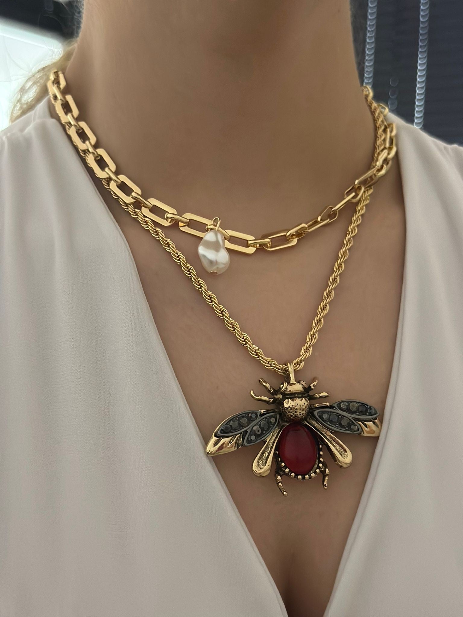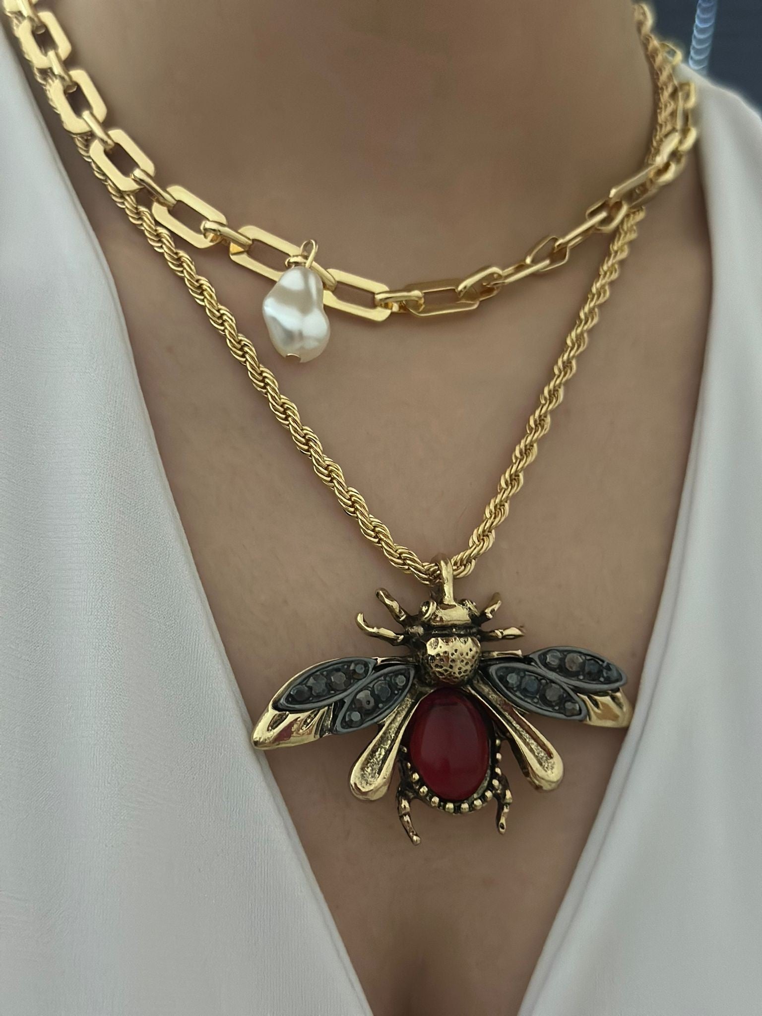 Barok İnci Ve İkili Zincir Detay Arı Kolye