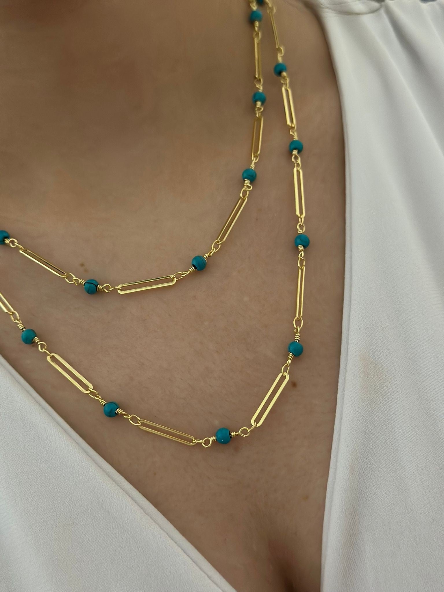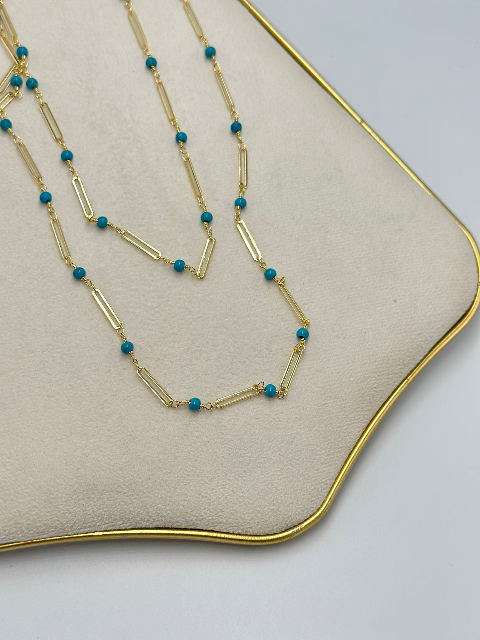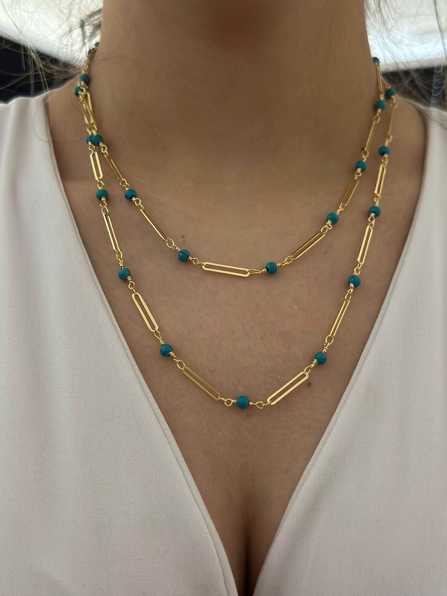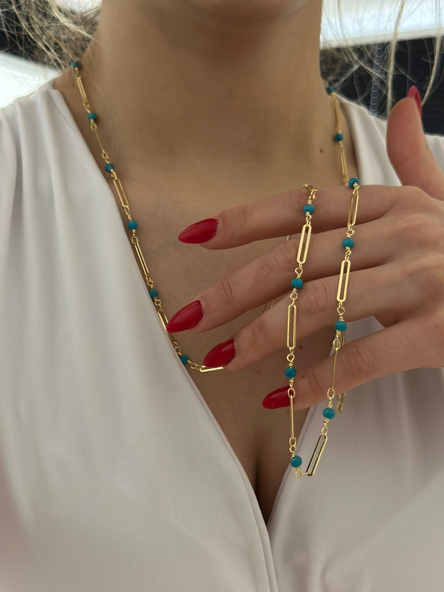 Firuze Taş Detaylı Uzun Dolamalı Çelik Kolye