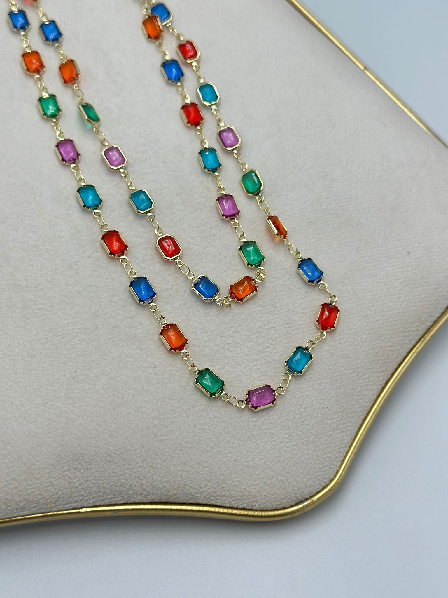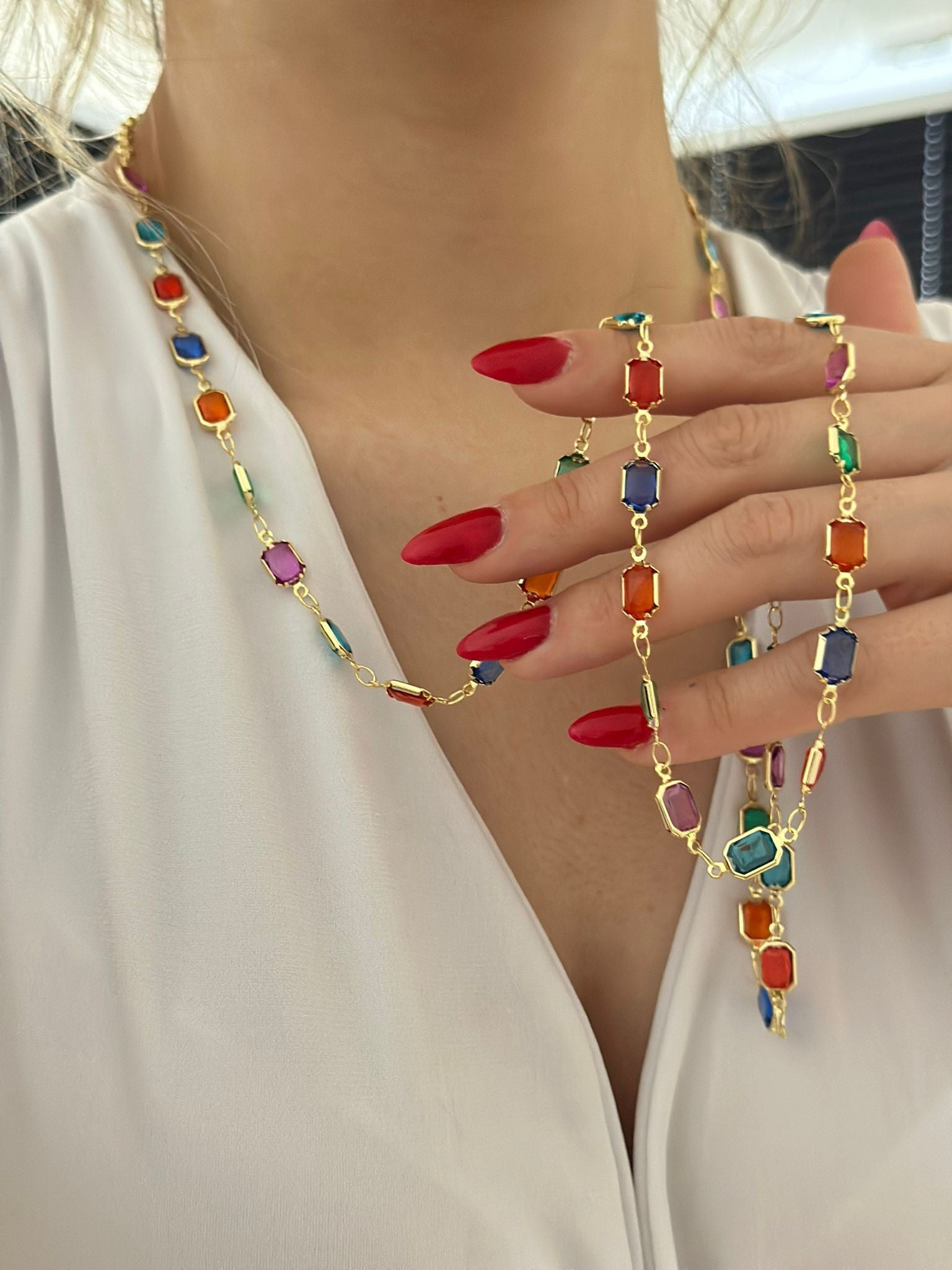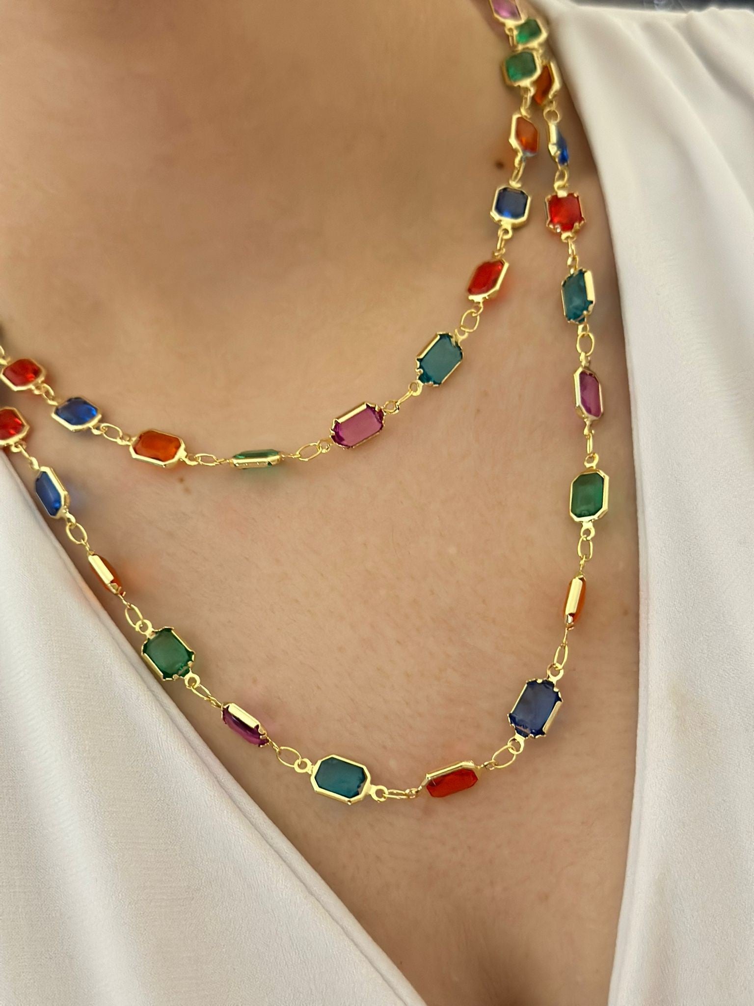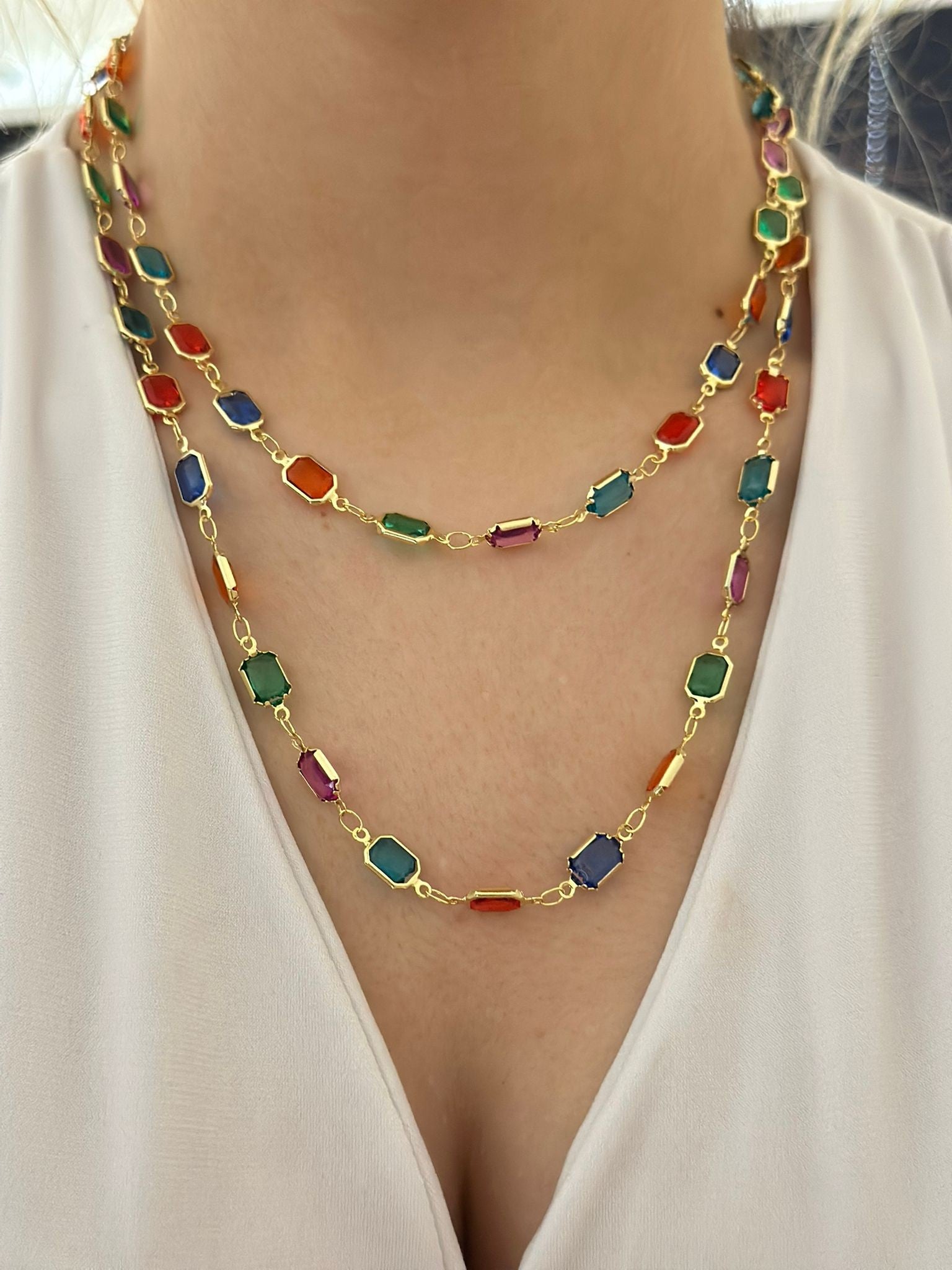 Renkli Kare Kesim Uzun Dolamalı Çelik Kolye