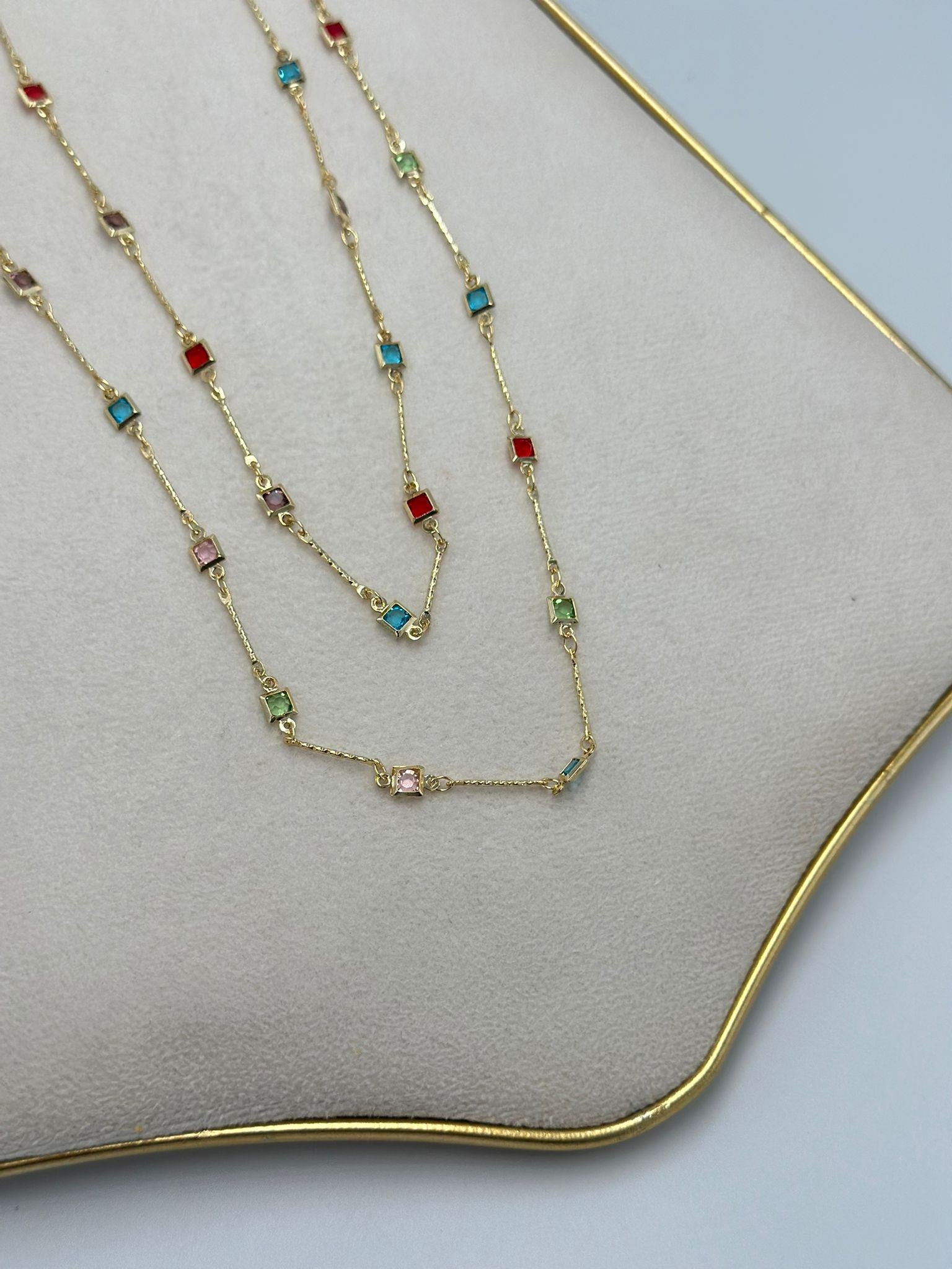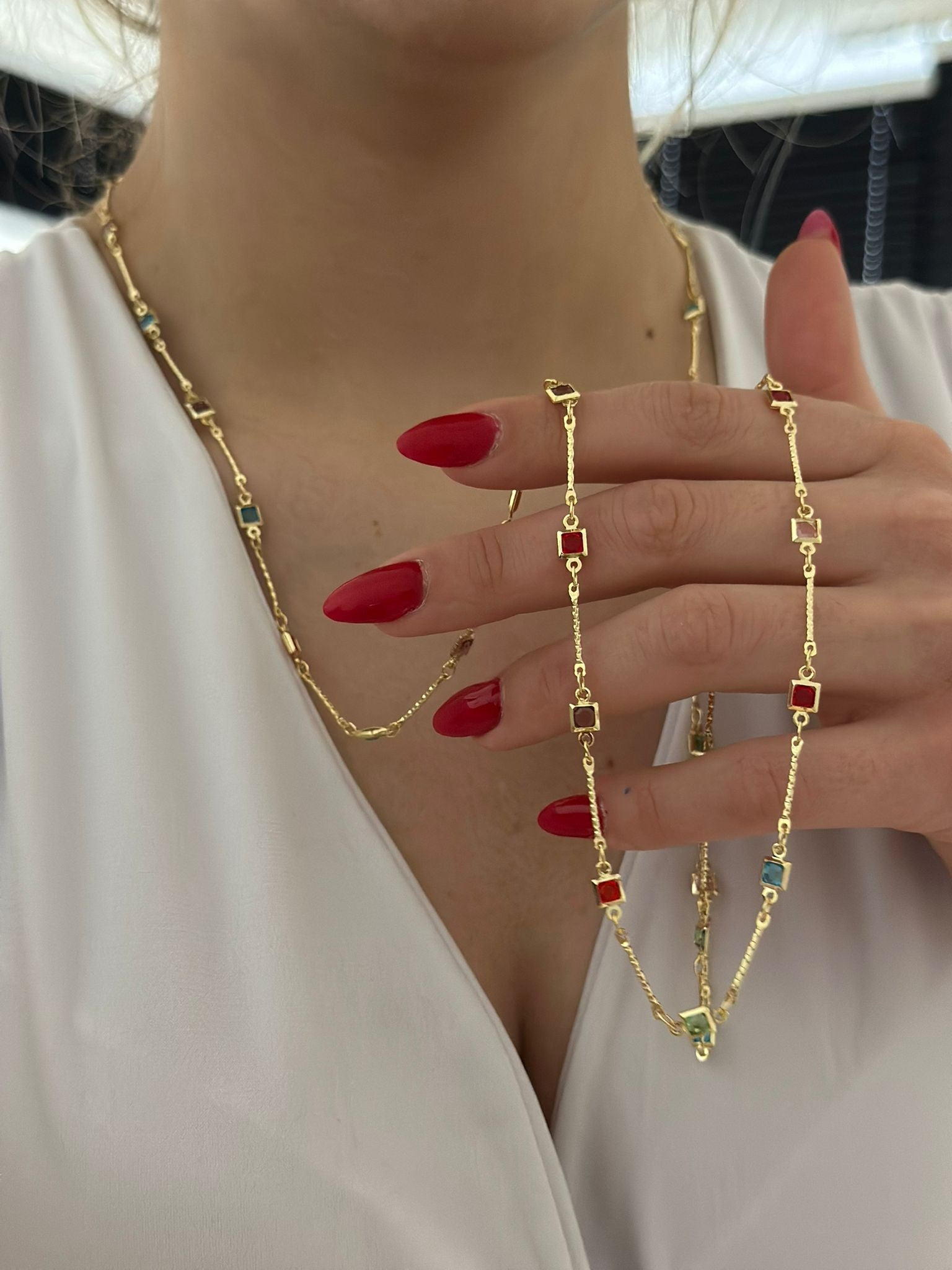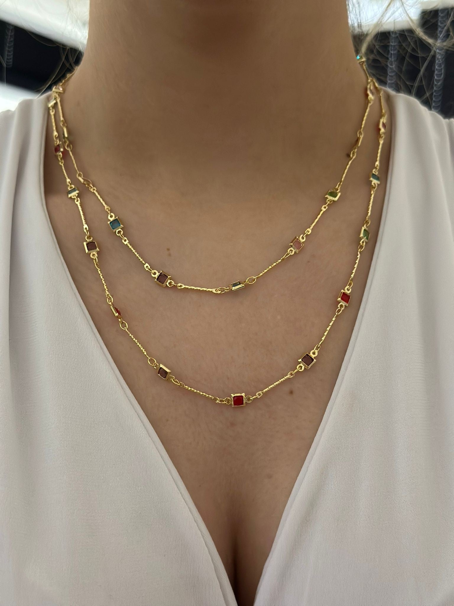 Renkli Kare Taş Detay Dolamalı Çelik Kolye
