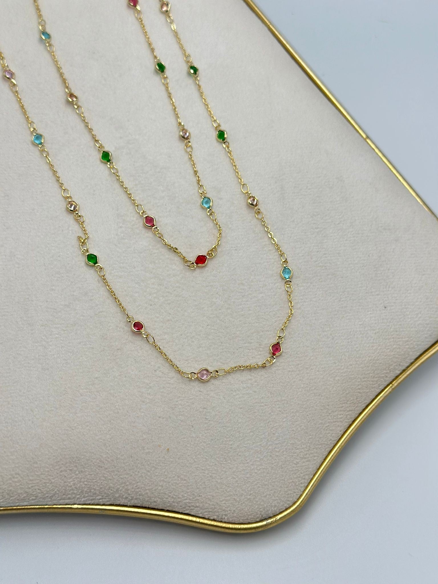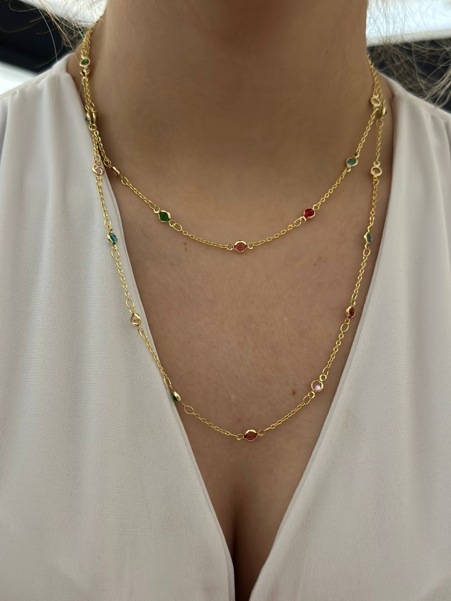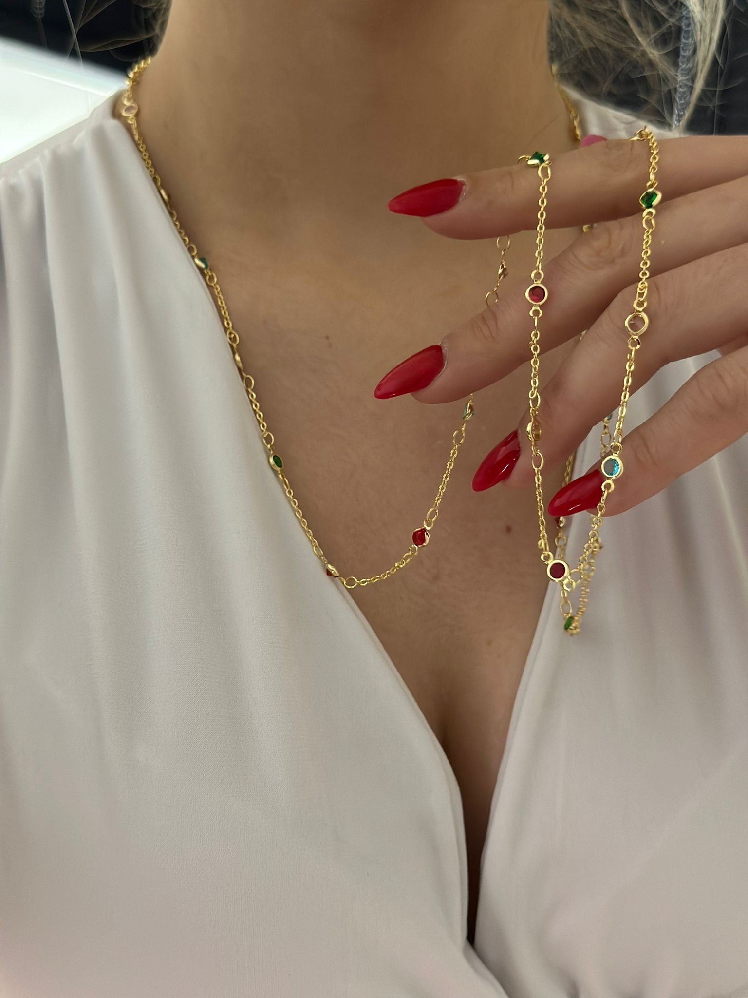 Renkli Tek Taş Detay Uzun Dolamalı Çelik Kolye