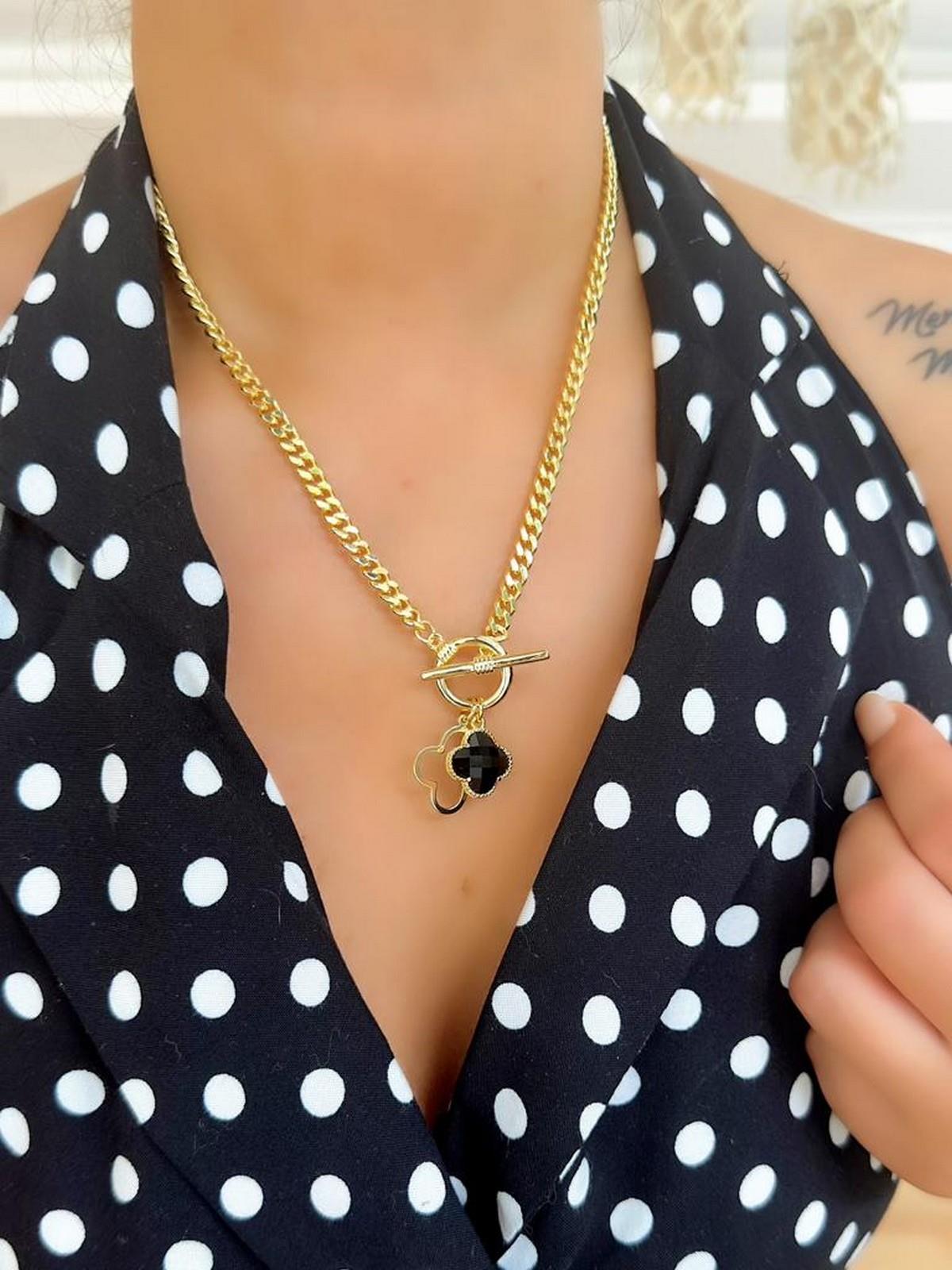 Siyah Cam Taş Detaylı Yonca Model Kolye