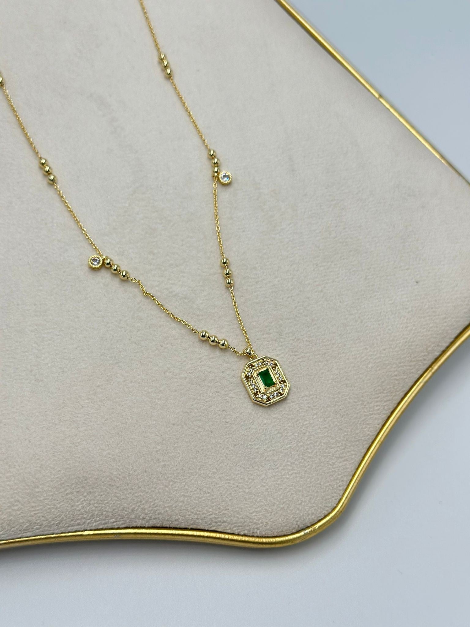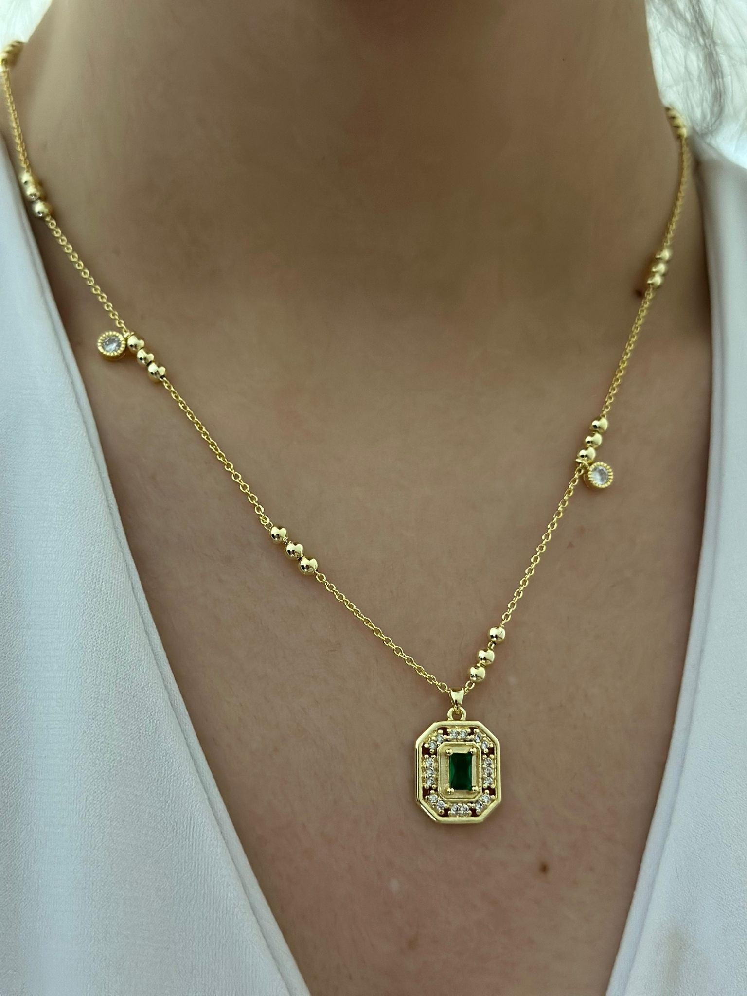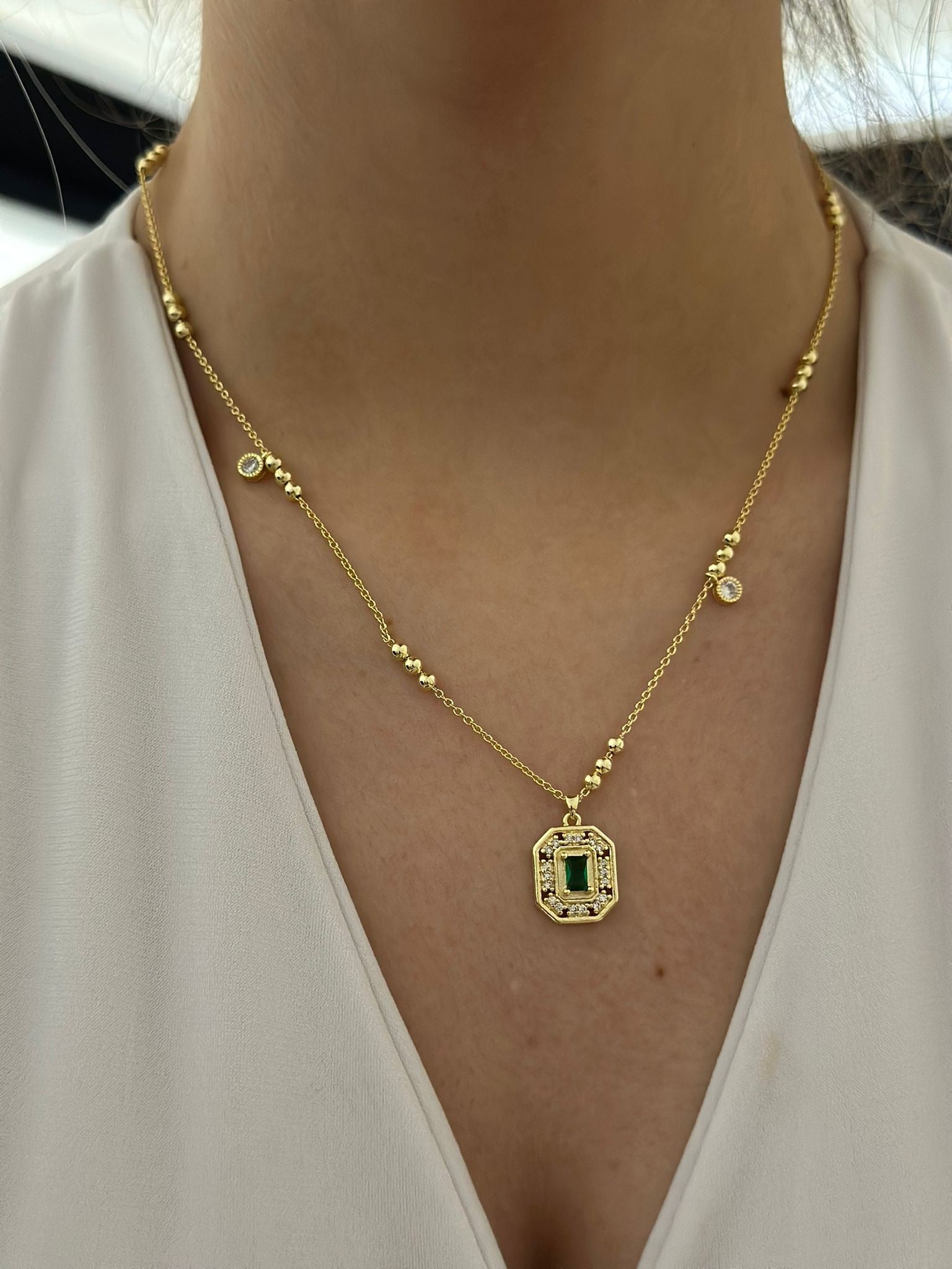 Yeşil Baget Taş Ve Topçuk Detay Çelik Kolye