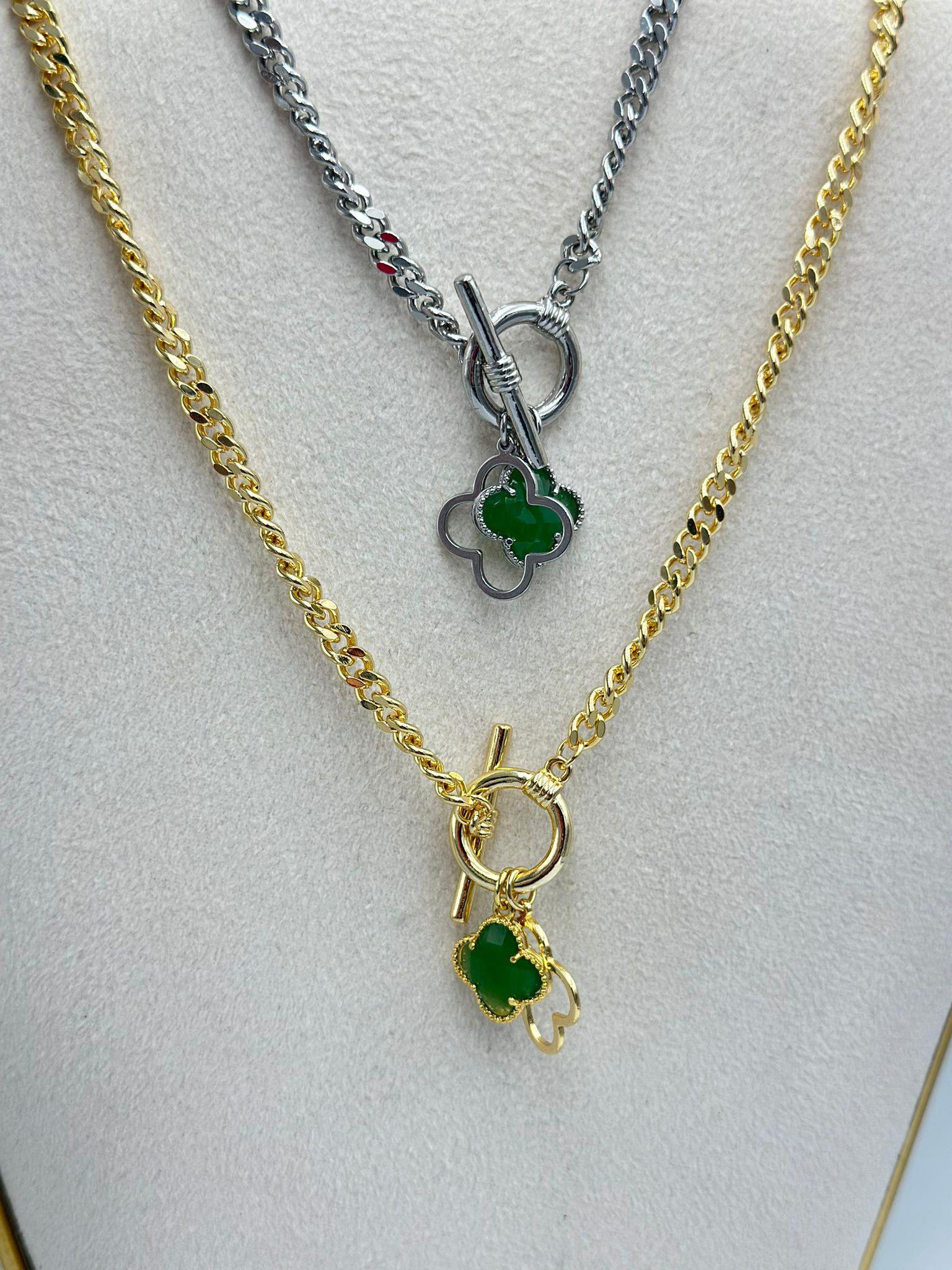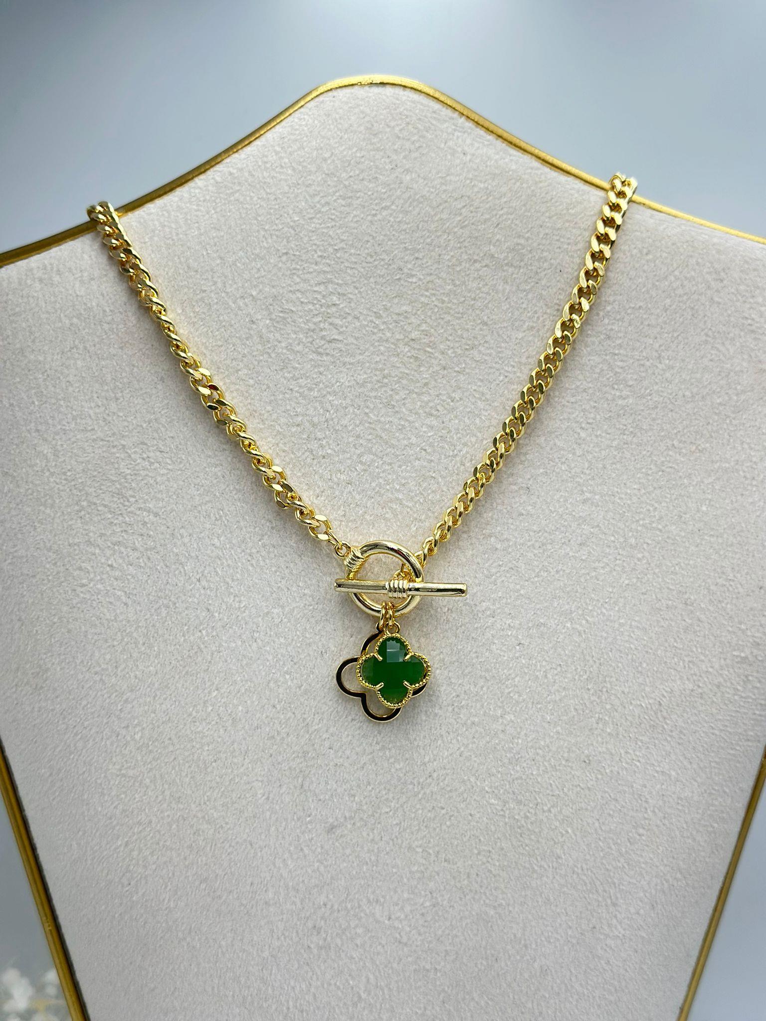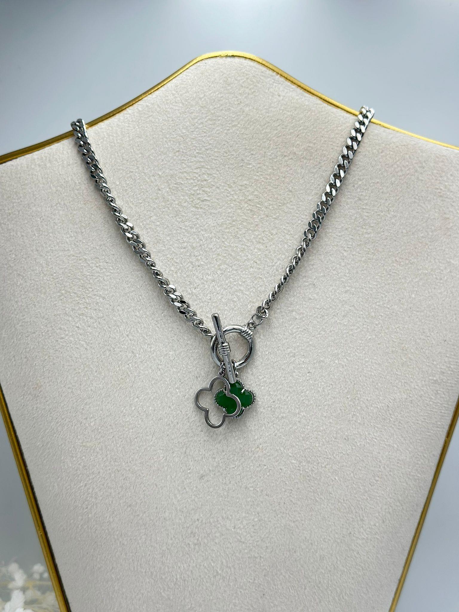 Yeşil Cam Taş Detaylı Yonca Model Kolye