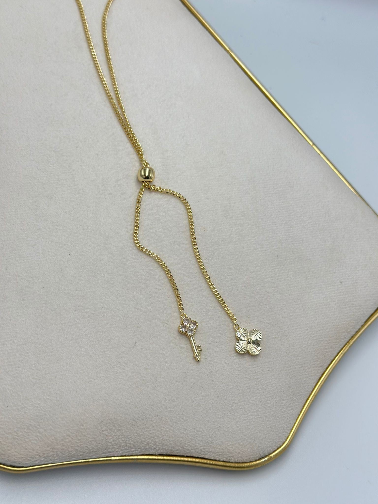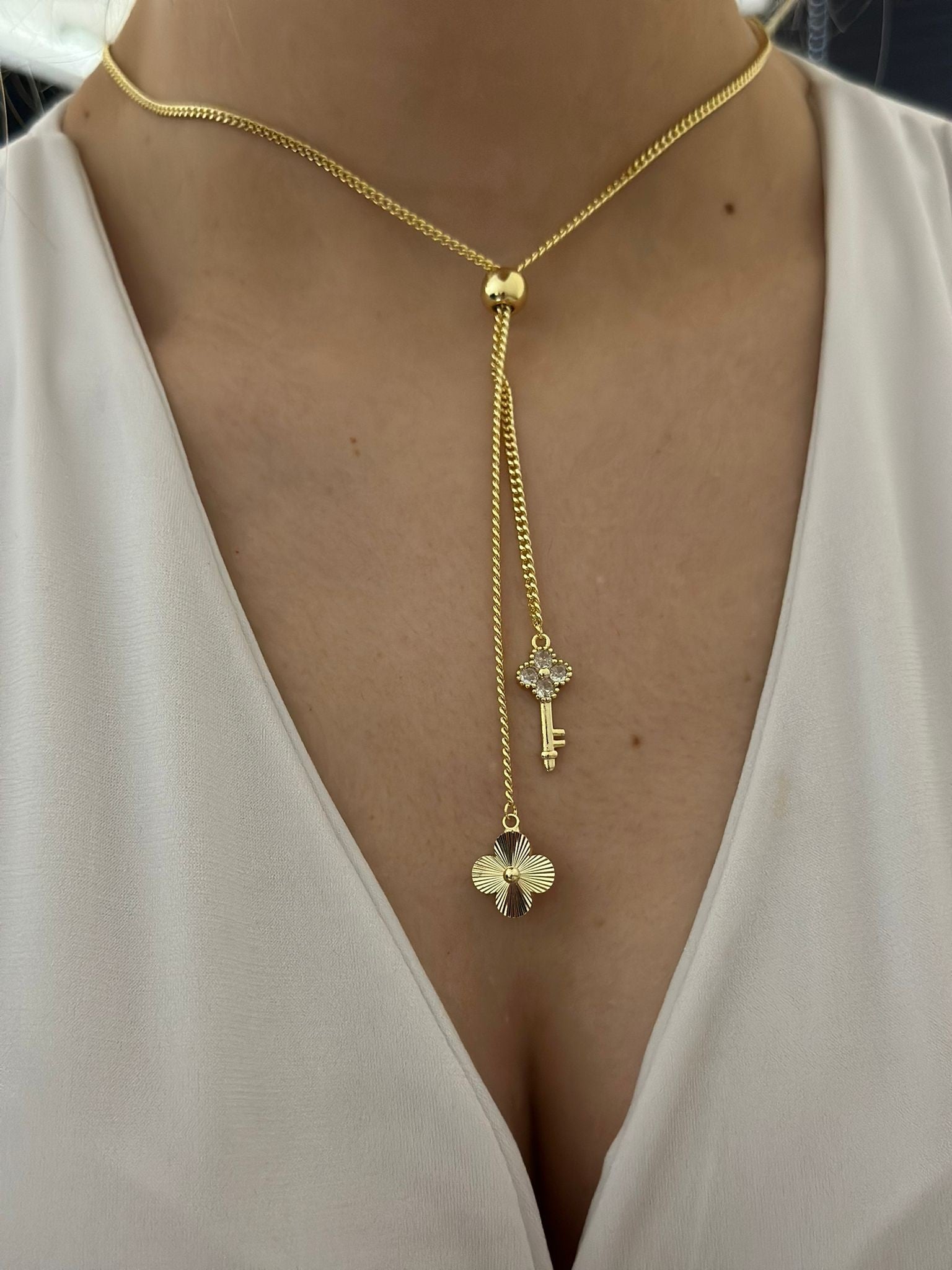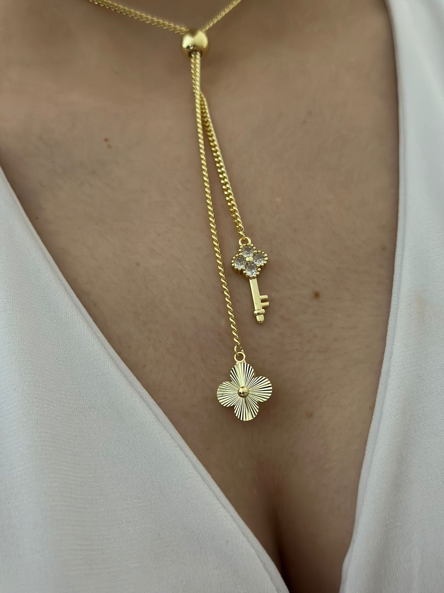 Yonca Ve Anahtar Detay Çelik Uzun Asansör Kolye