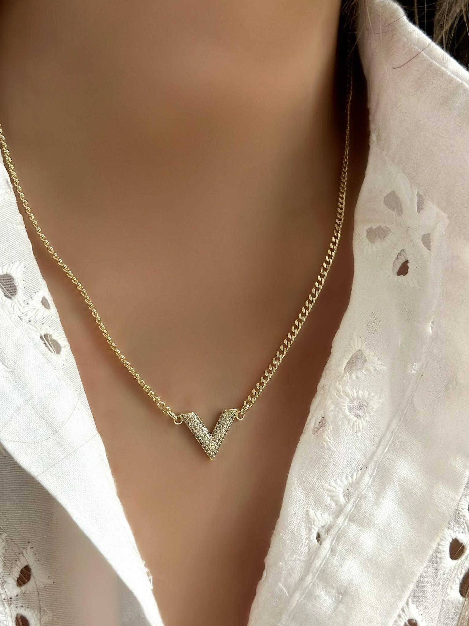 Zirkon Taş V Plaka Detaylı Çelik Zincir Gıld Kolye (47 cm)
