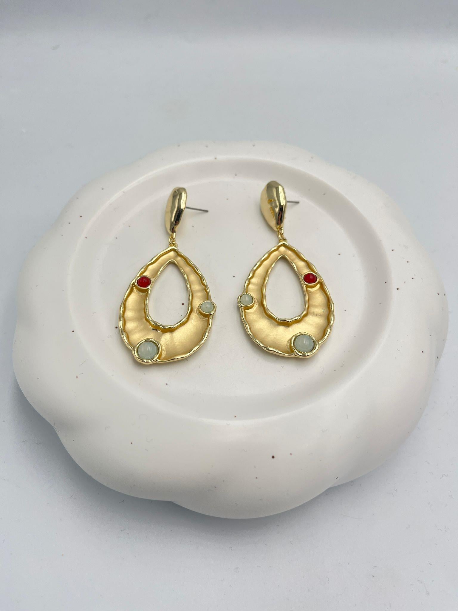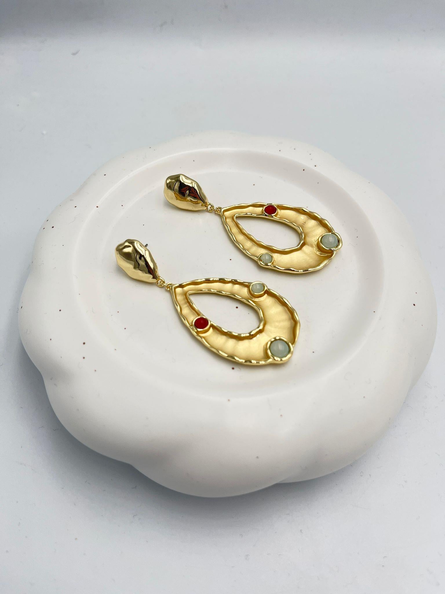 Özel Tasarım Yeşil ve Kırmızı Taş Detaylı Sallantılı Gold Küpe
