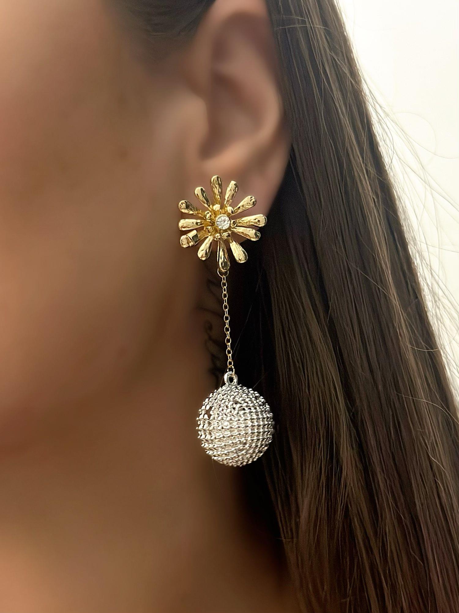 Zirkon Taş Topçuk ve Çiçek Plaka Detaylı Sallantıılı Küpe (Pirinç Kaplama)
