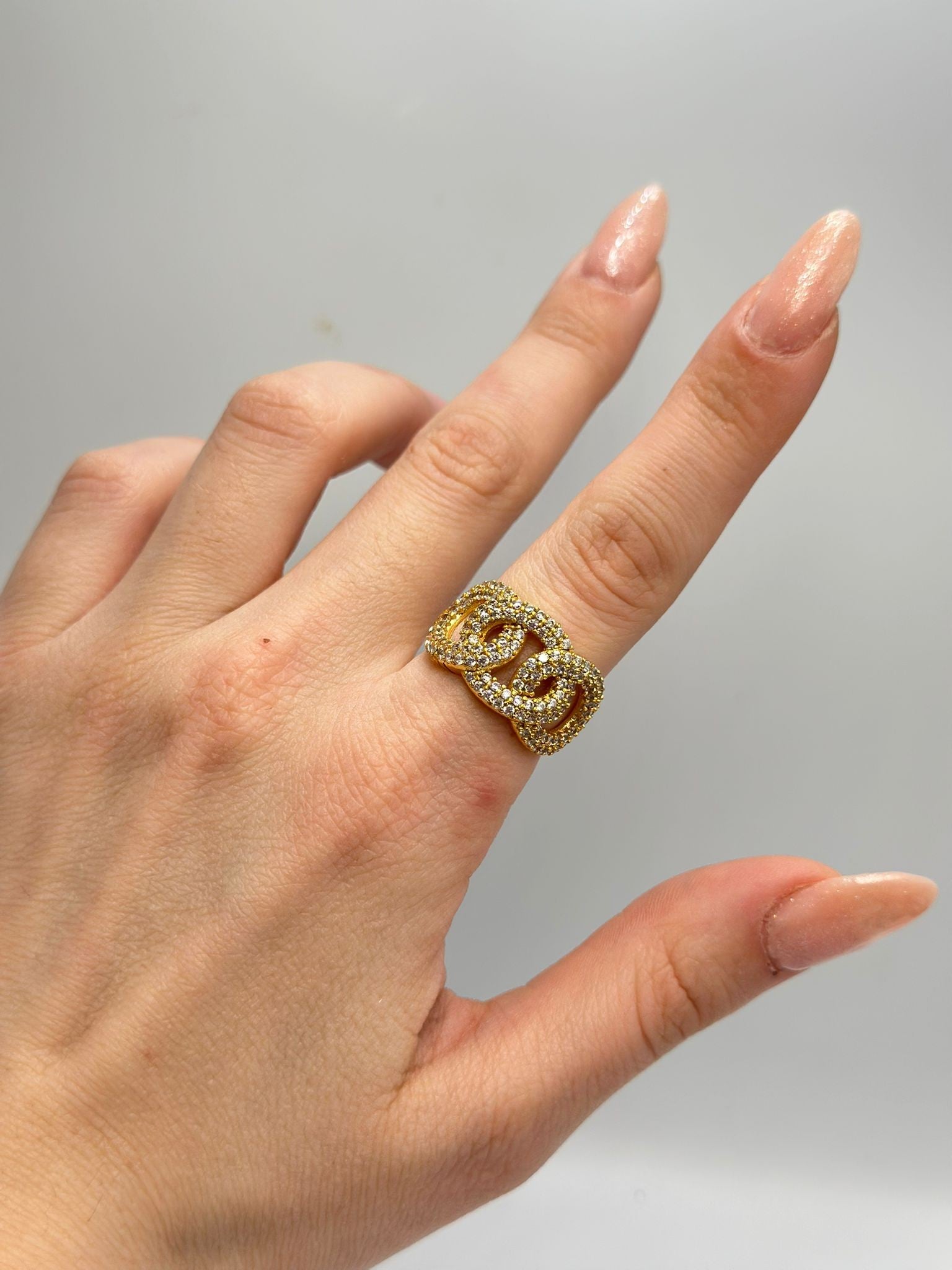 Kalın Zincir Üstü Zirkon Taş Detaylı Ayarlamalı Gold Yüzük