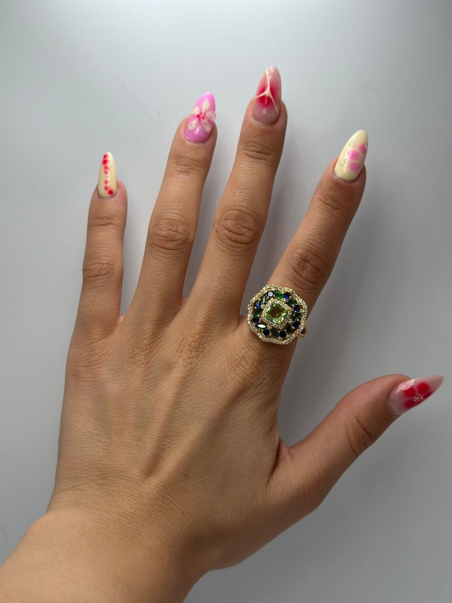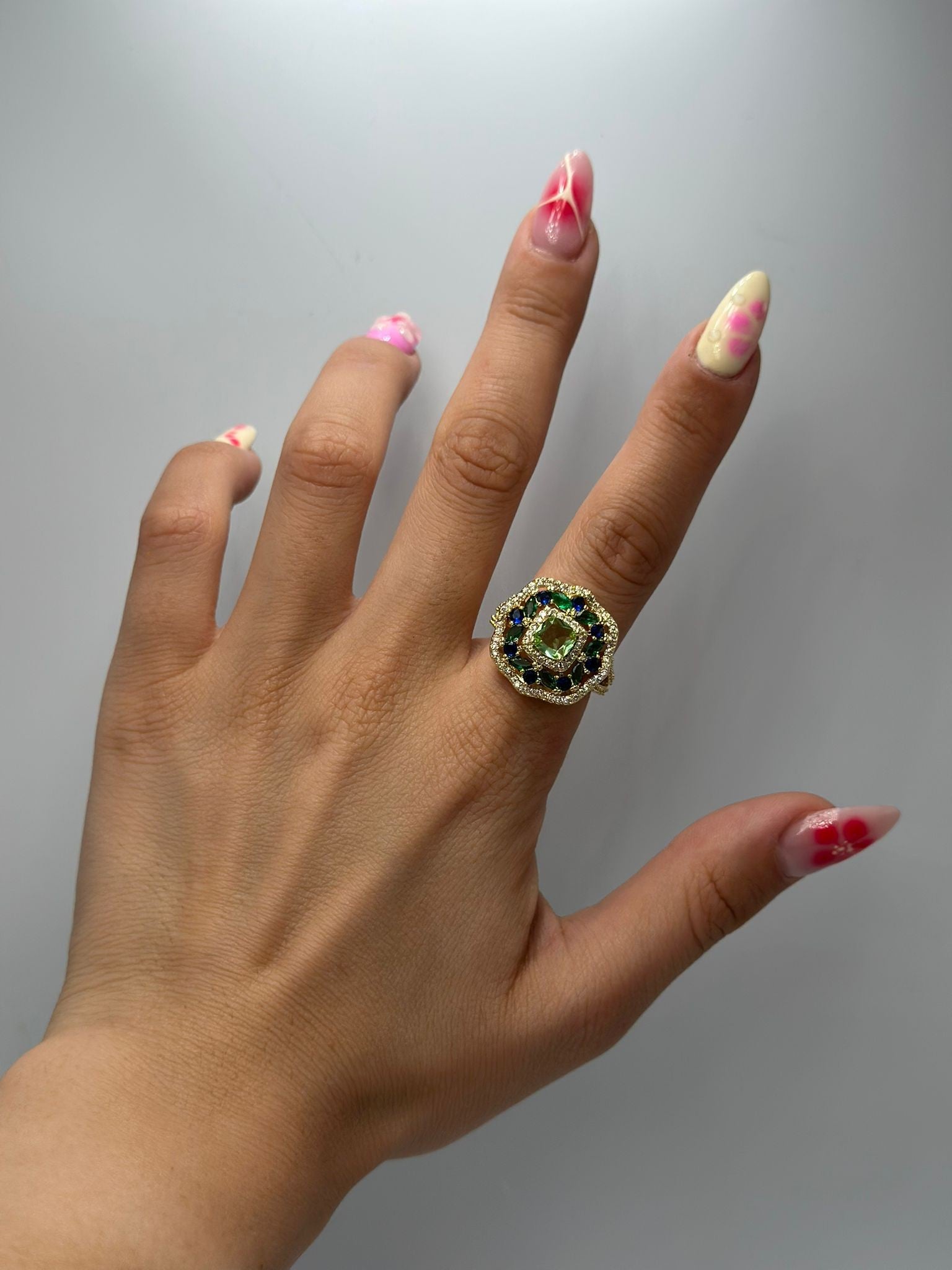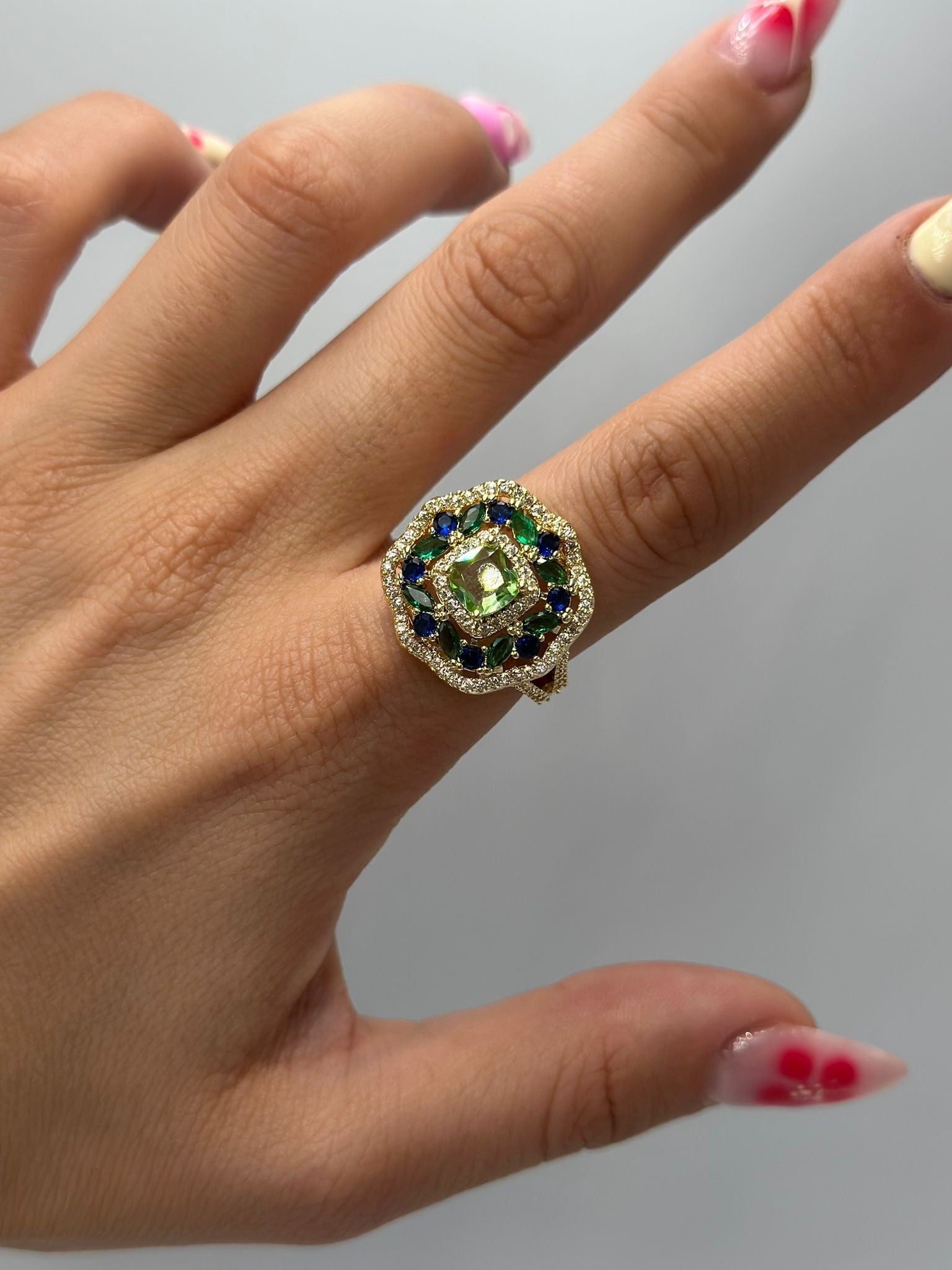Mavi Yeşil Taş Detay Çelik Çiçek Yüzük