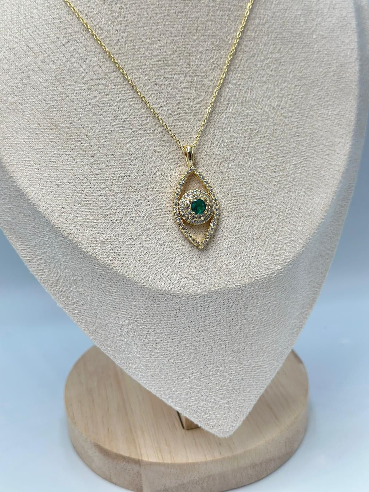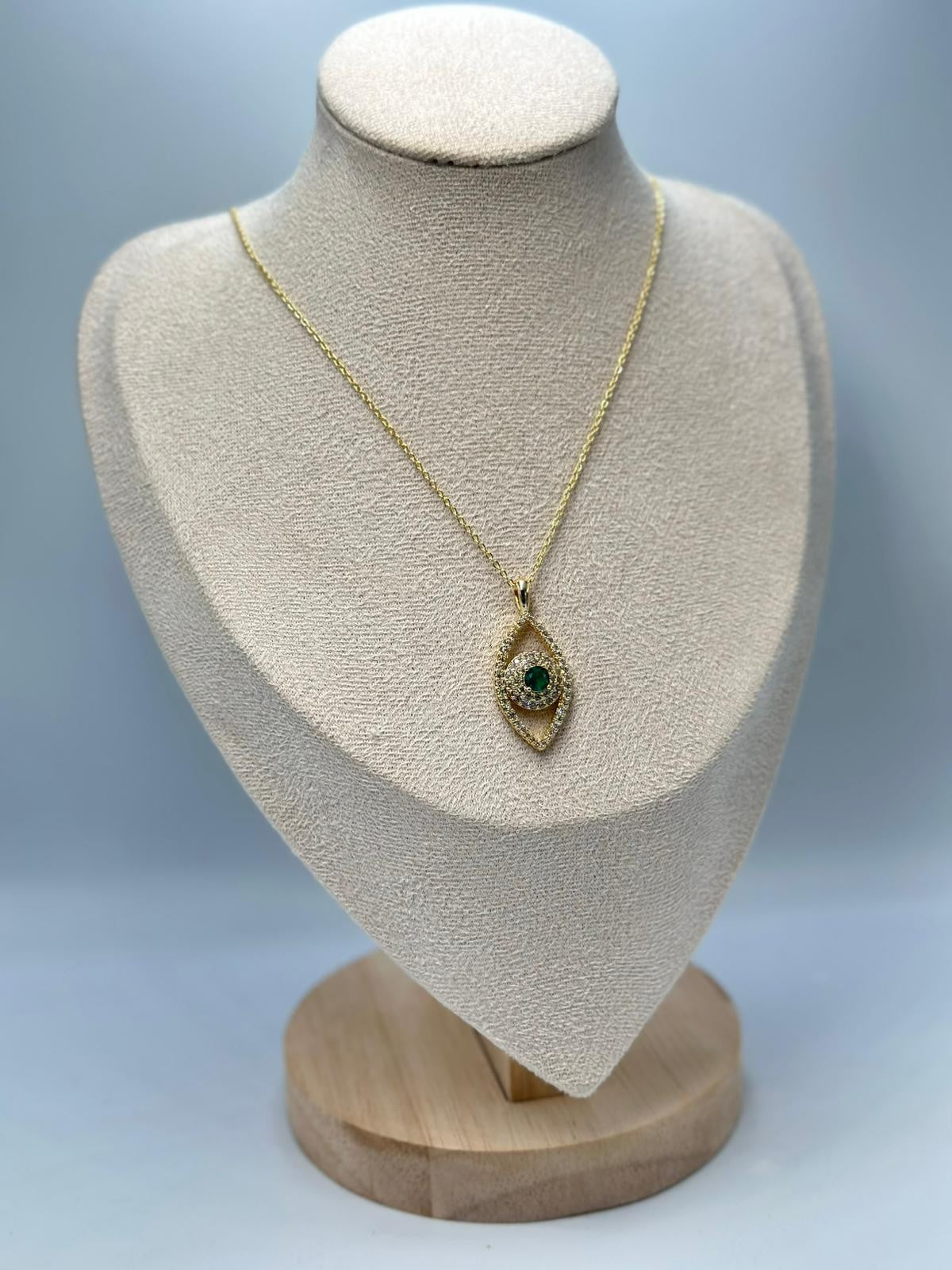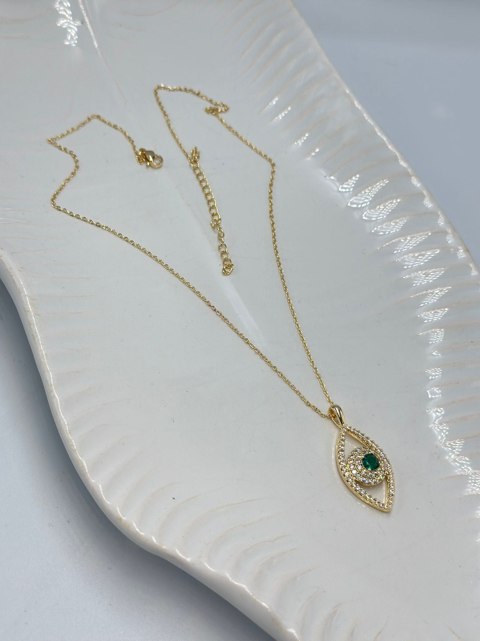 Yeşik Kristal Taş Göz Kolye (Pirinç Kaplama)(48Cm)